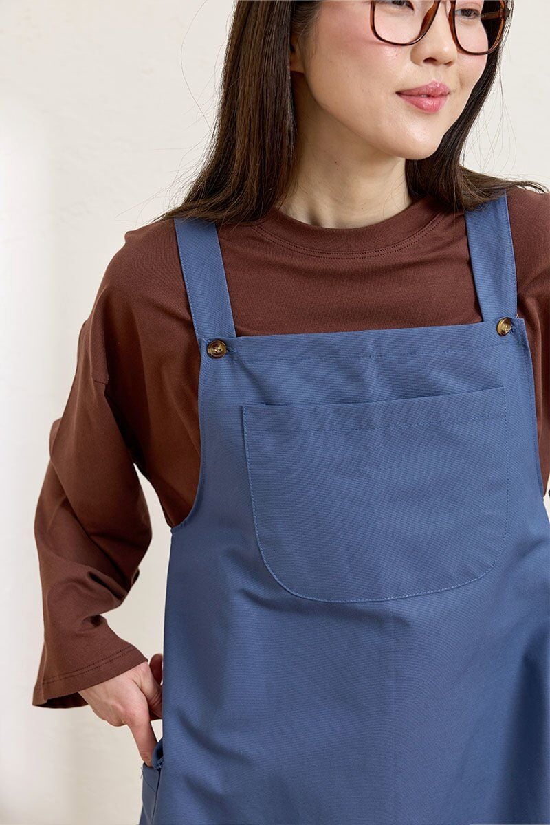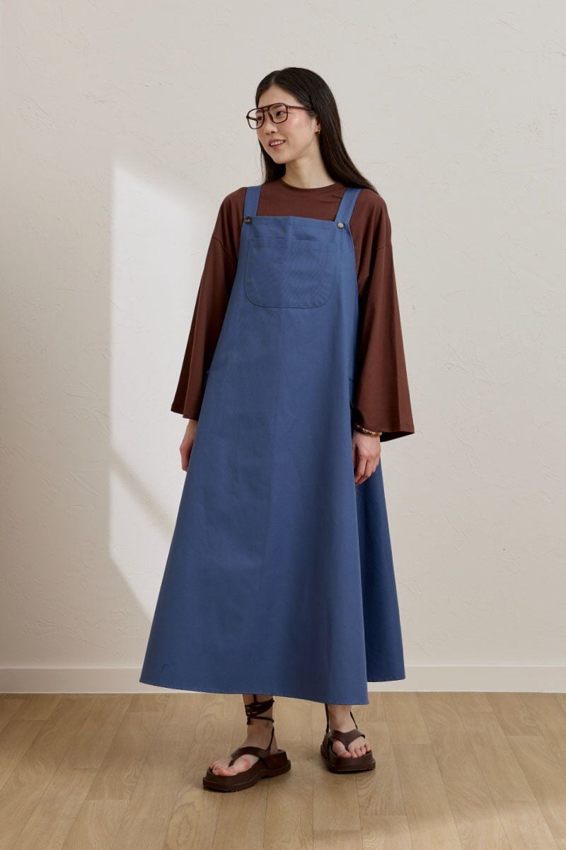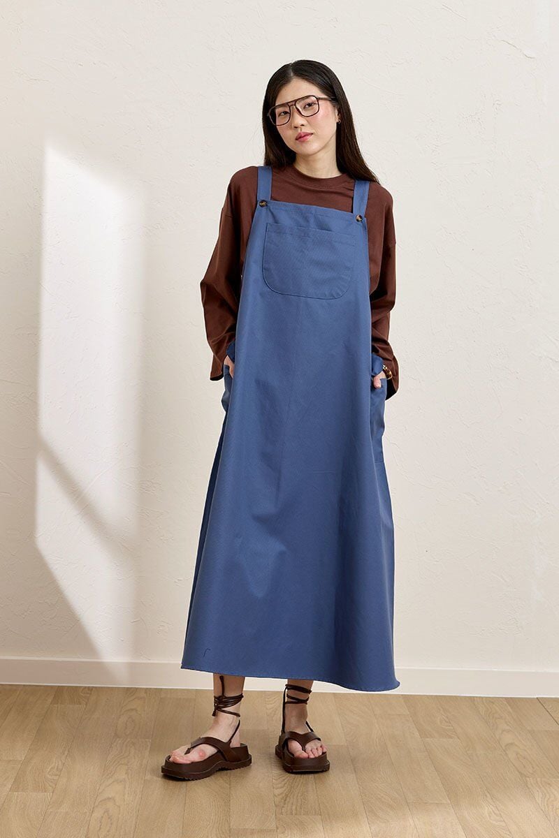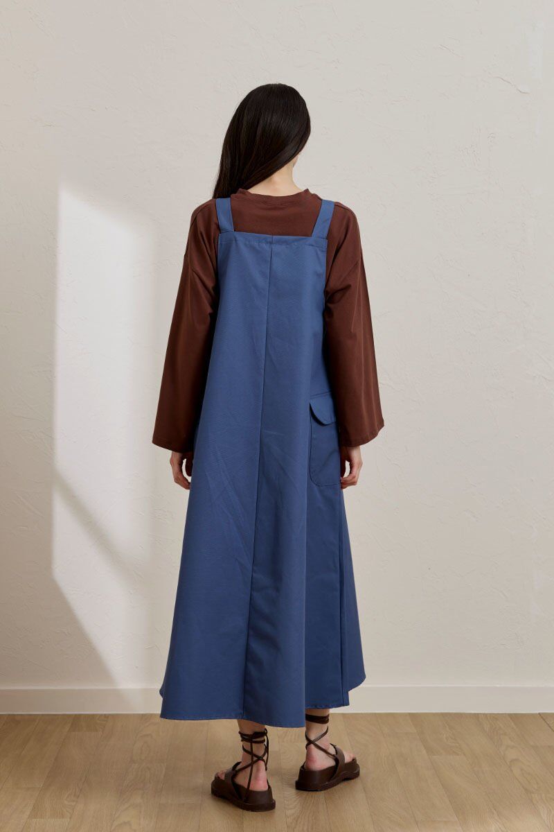 Bu indigo keten etekli salopet, rahat ve şık bir görünüm sunar.