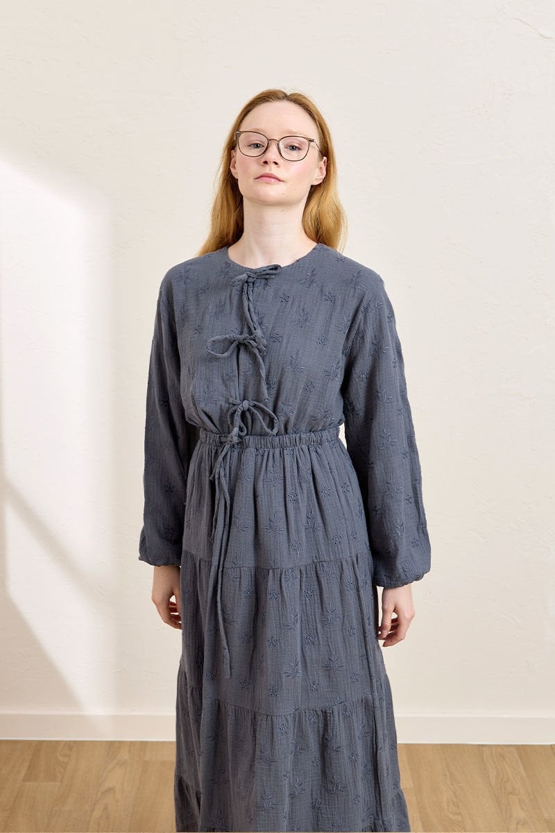 İndigo Fistolu Müslin Kat Etek & 3 Fiyonklu Bluz Takım