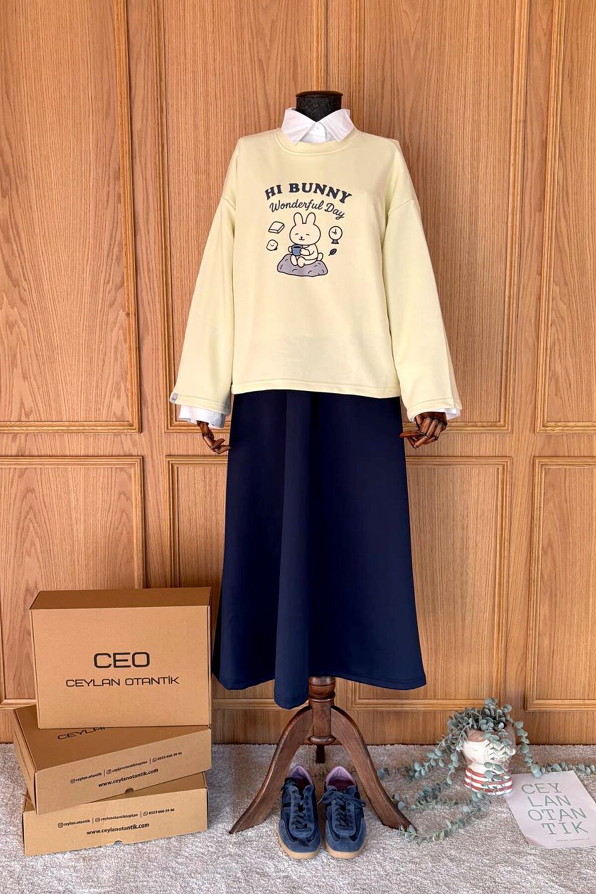 Tereyağ Sarısı Tavşan Baskılı 3 İp Body & İndigo Scuba Etek Takım