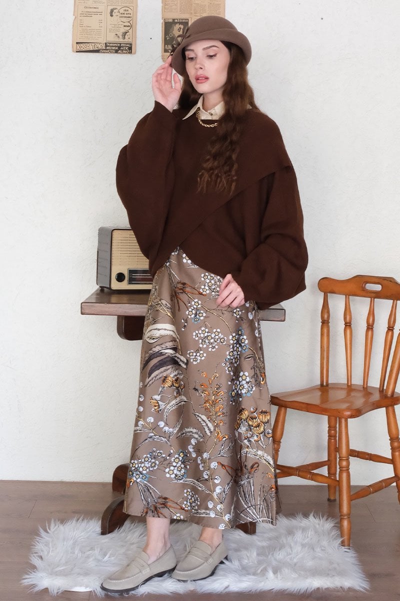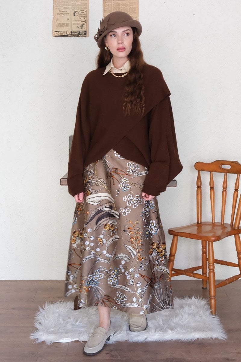 Kahverengi Desenli Pamuk Saten Kloş Etek