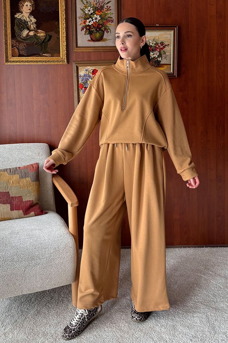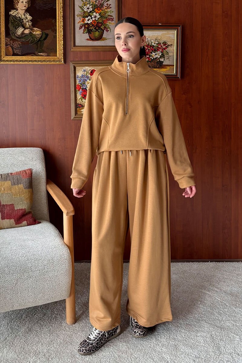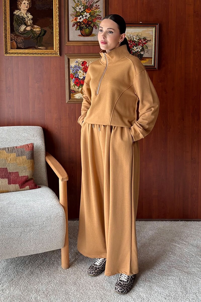 Karamel 3 İplik Yarım Fermuarlı Eşofman Takım