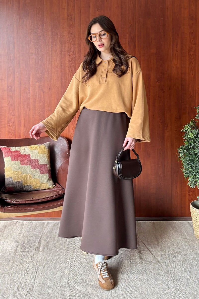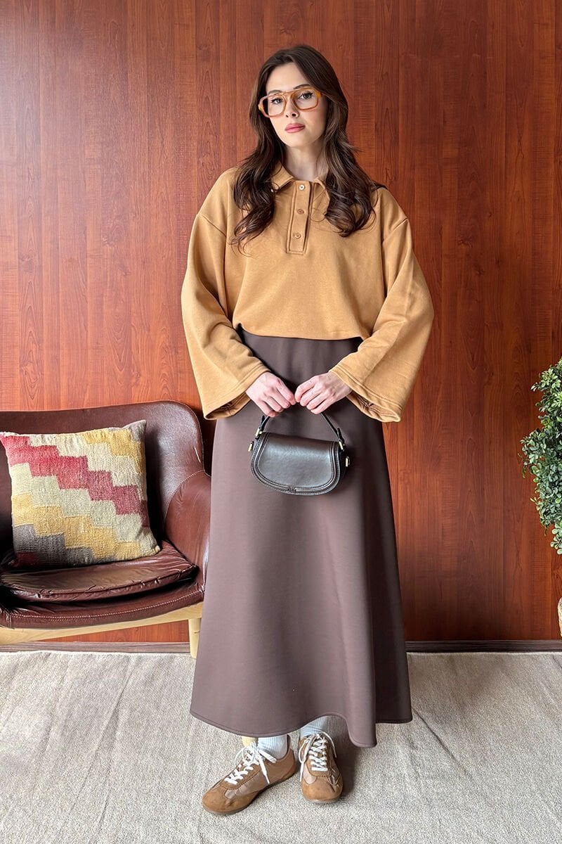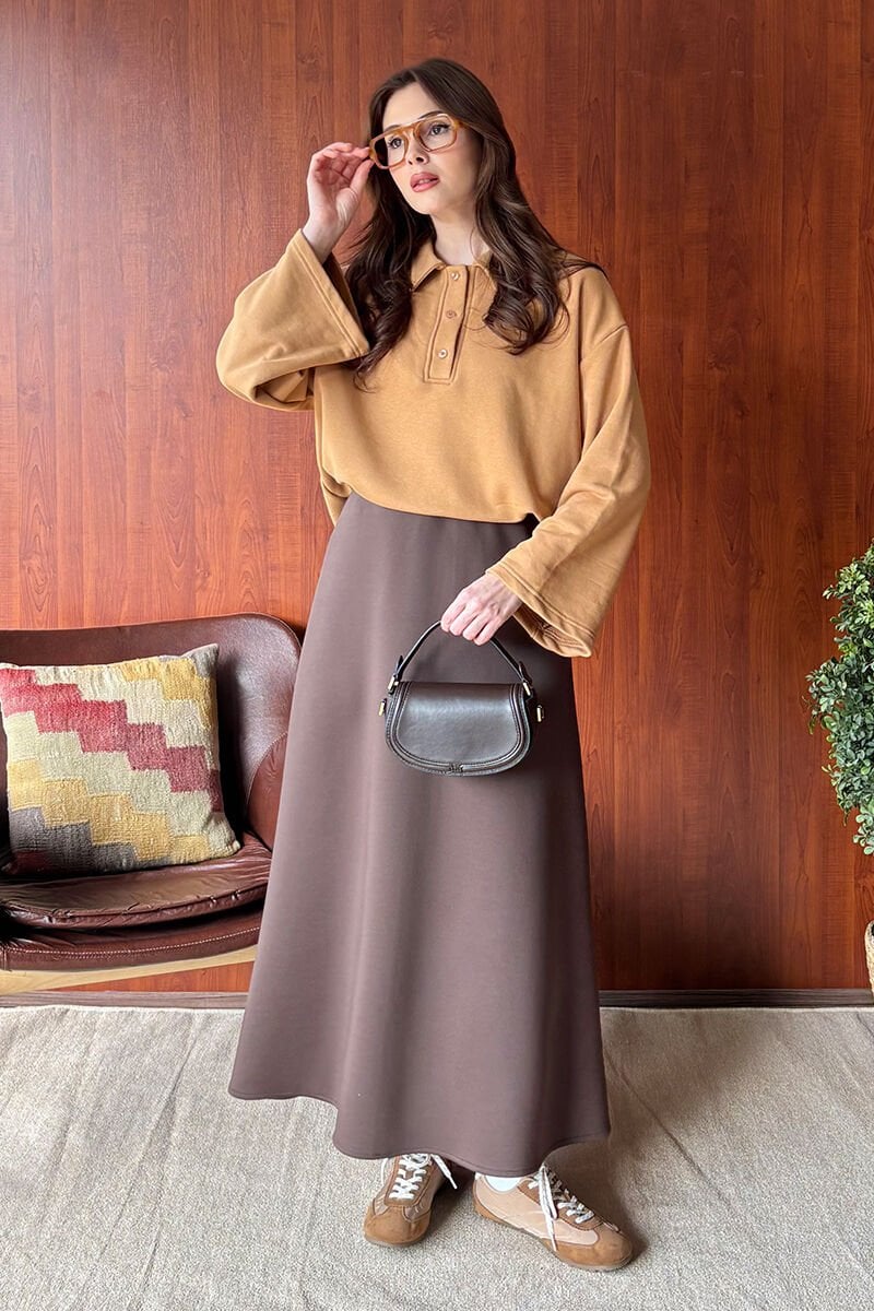 Karamel 3 İplik Polo Yaka Body & Acı Kahve Scuba Etek Takım