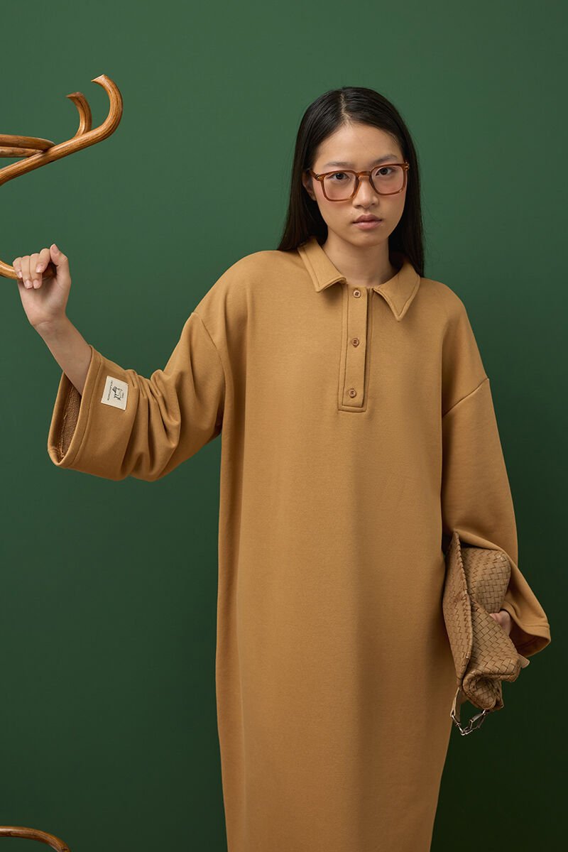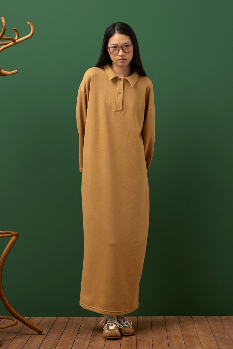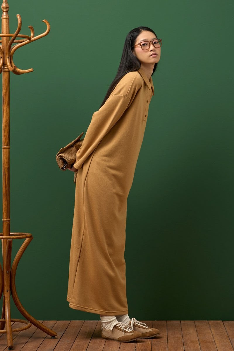 Bu şık ve rahat 3 iplik polo yaka uzun elbise, her an için harika bir seçenek.