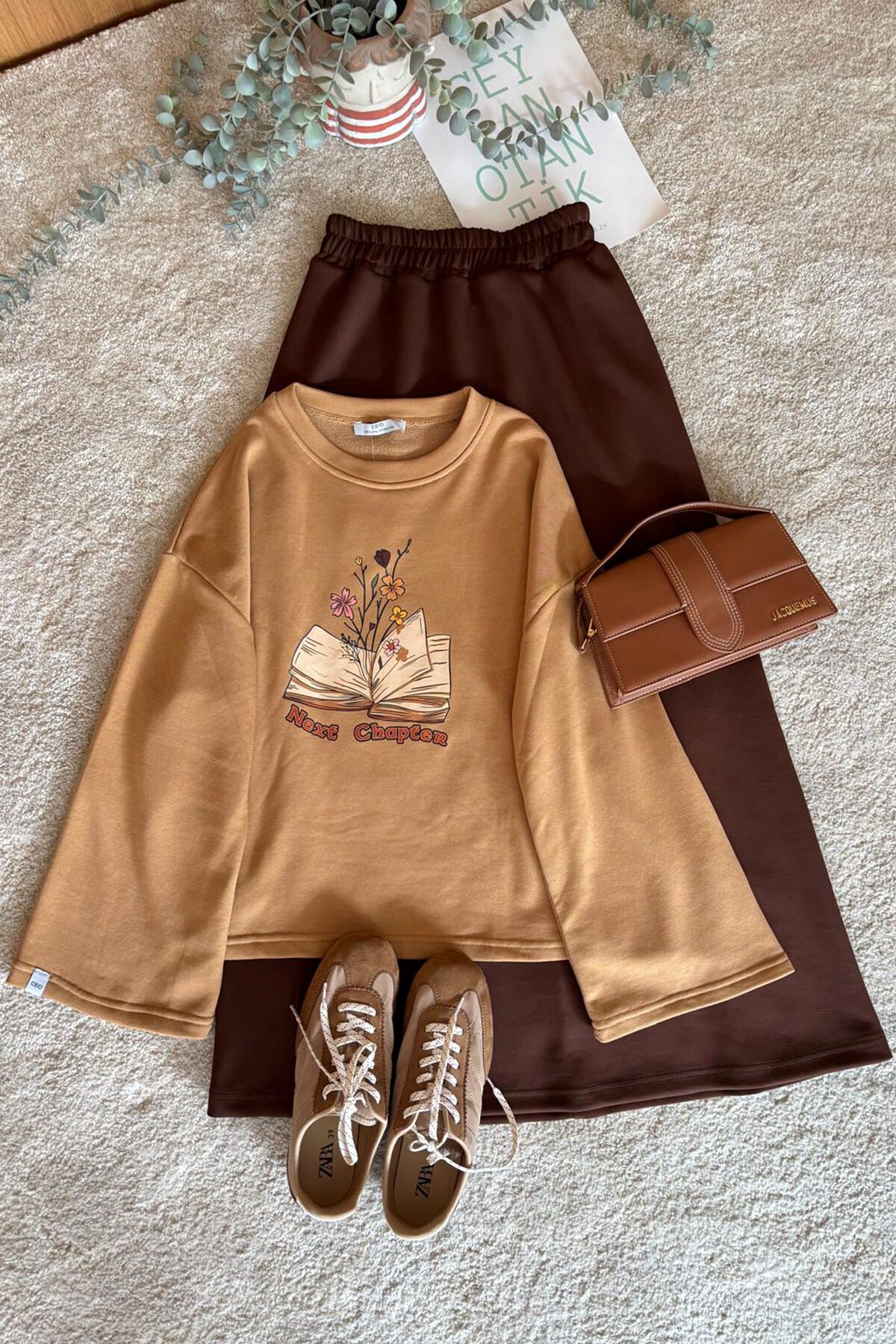 Karamel Baskılı 3 İp Body & Acı Kahve Scuba Etek Takım
