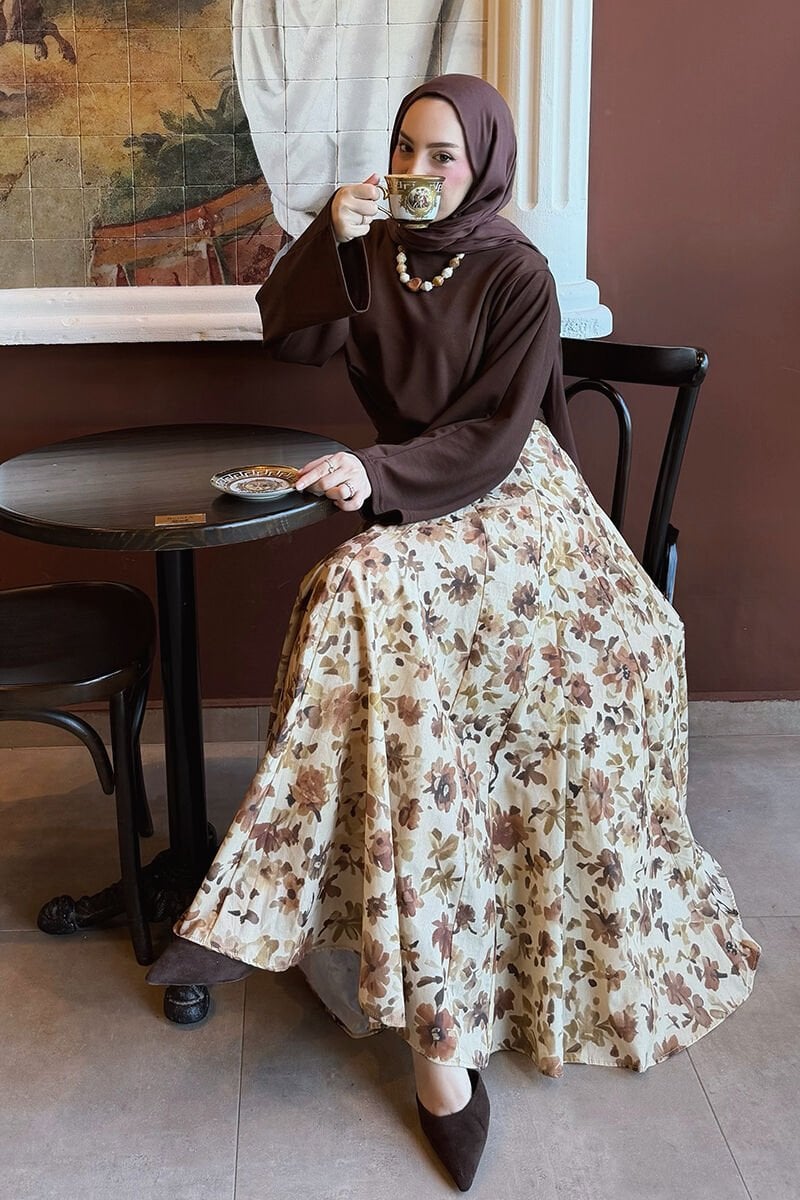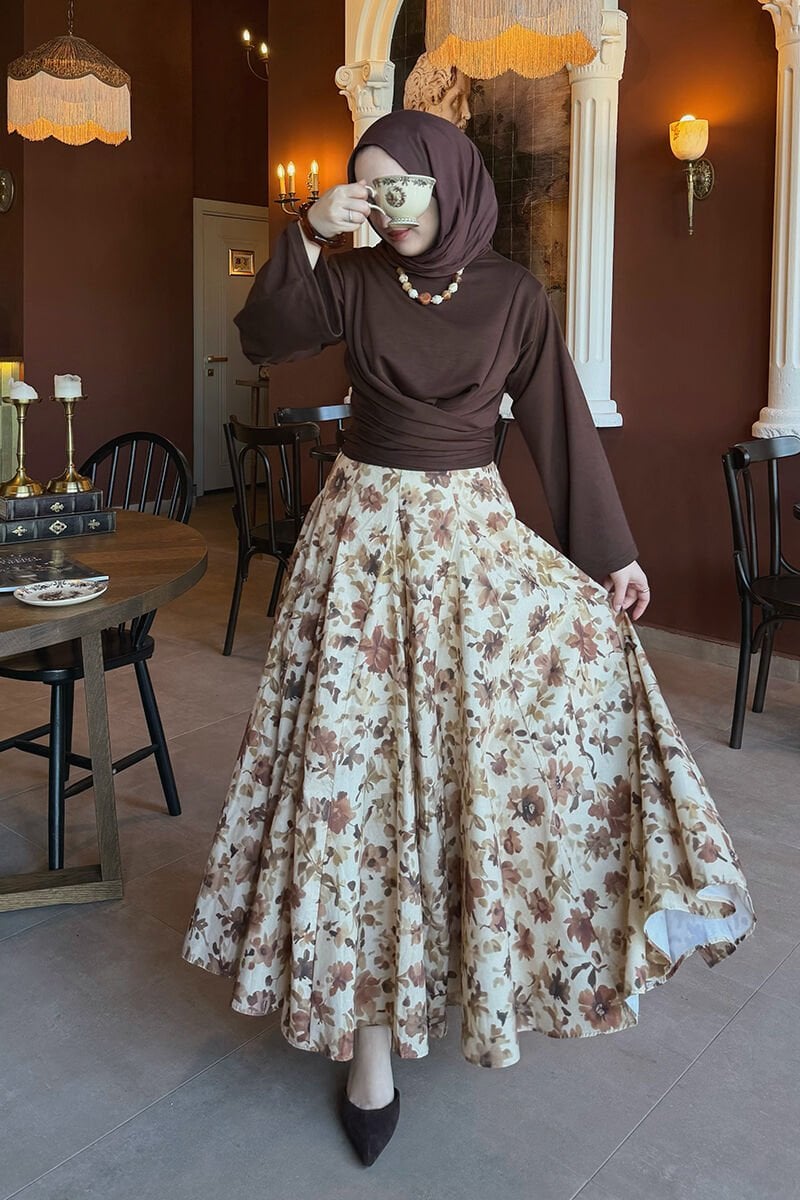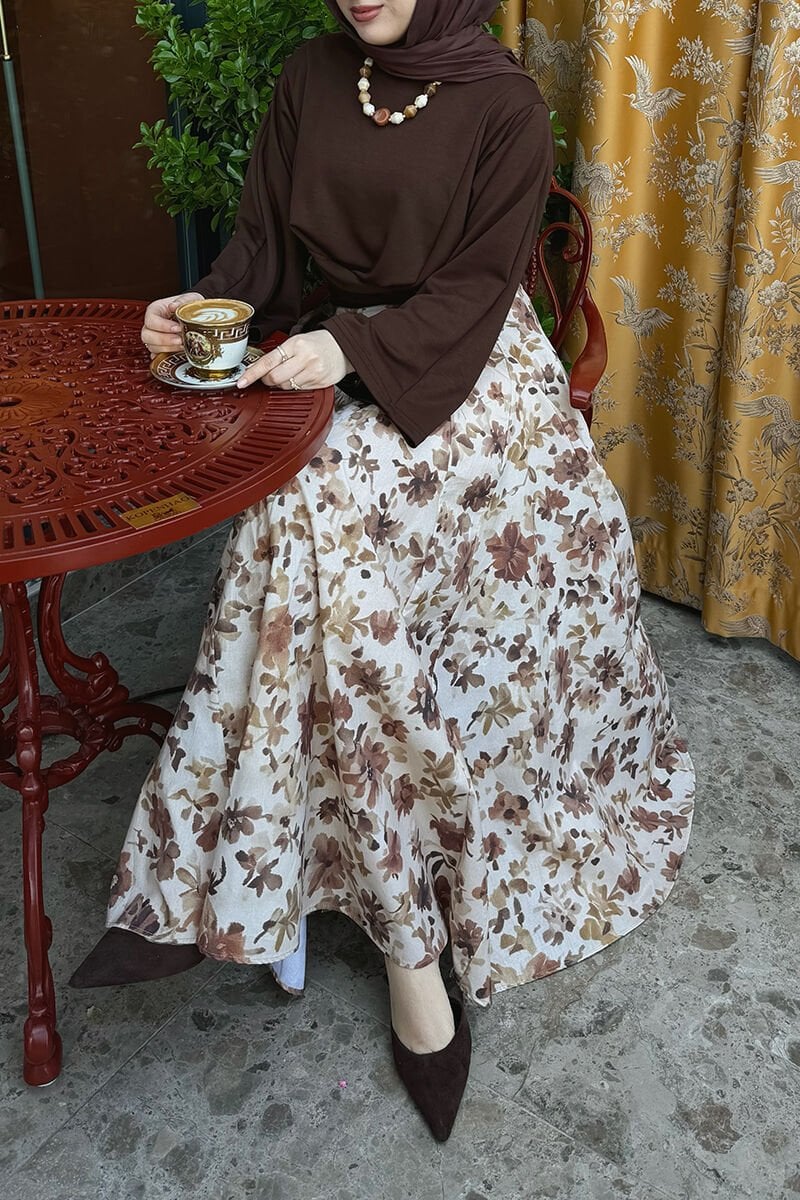 Karamel Çiçek Desenli Parçalı Etek