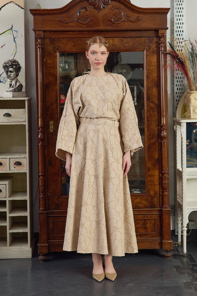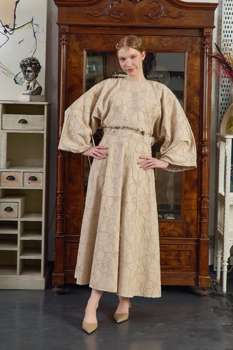 Bu muhteşem çiçek desenli etek takımı, şıklığı ve rahatlığı bir arada sunuyor.