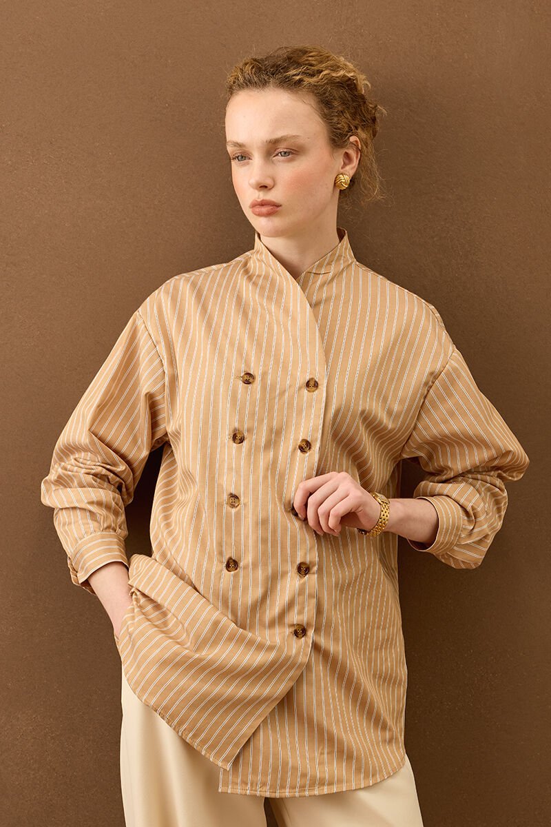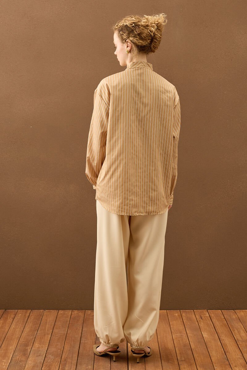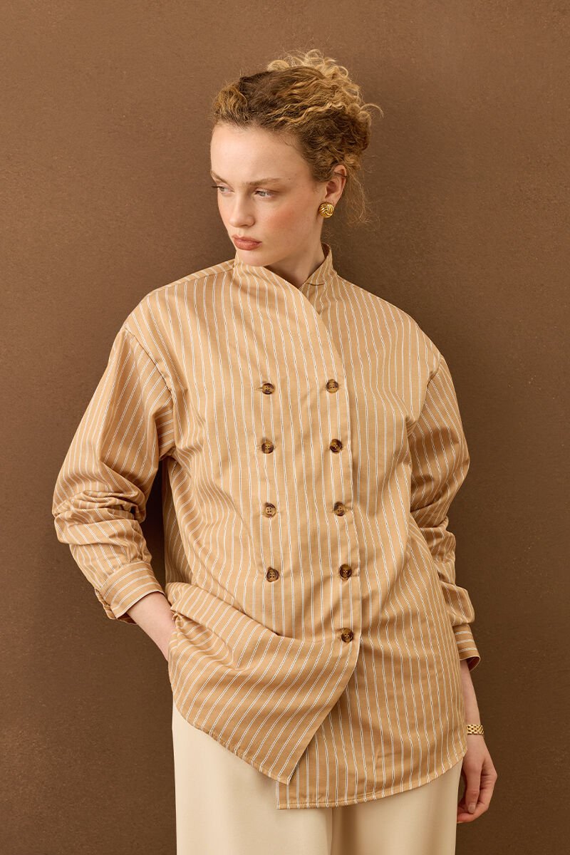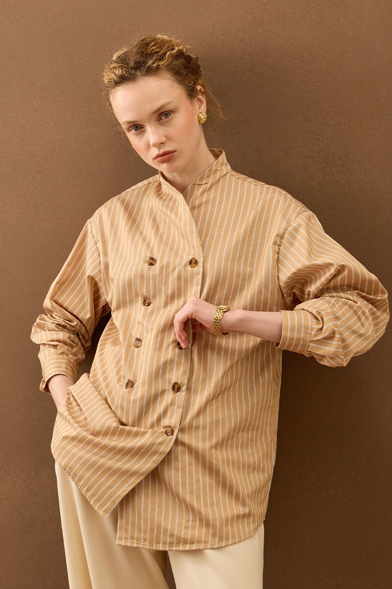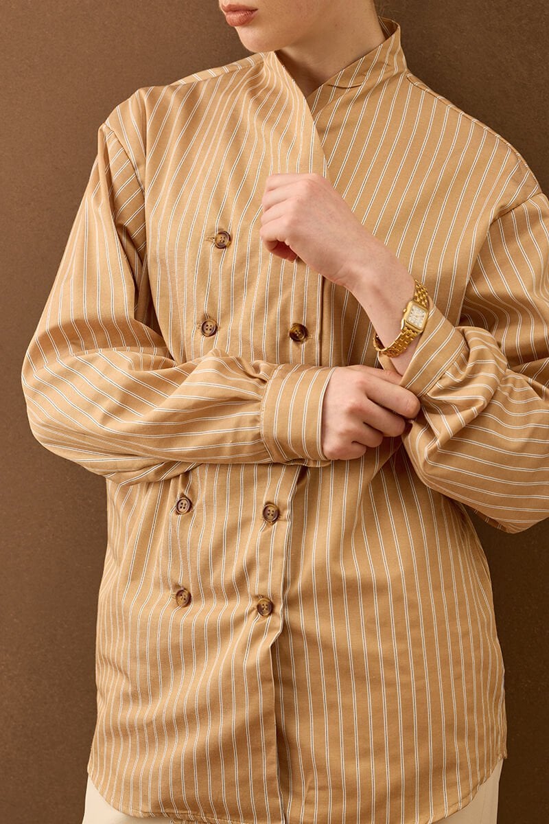 Karamel Çizgili Dik Yaka Retro Gömlek