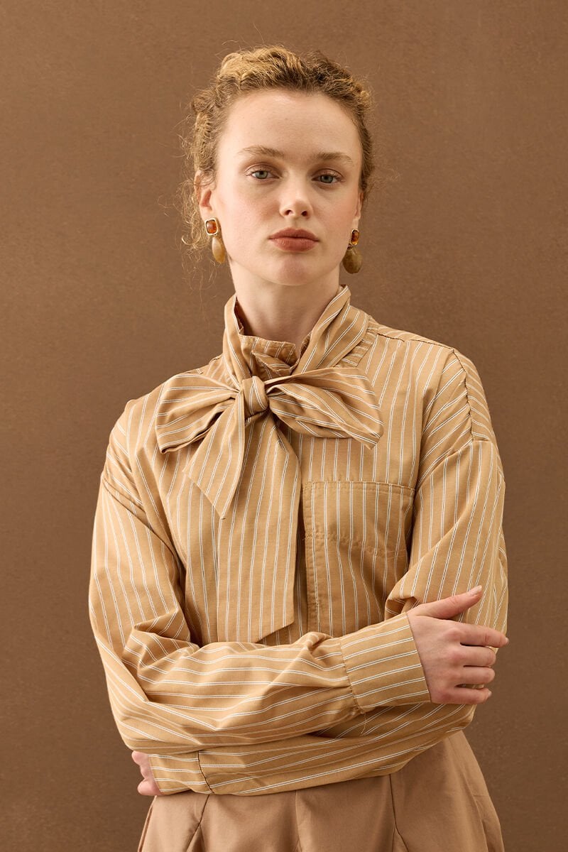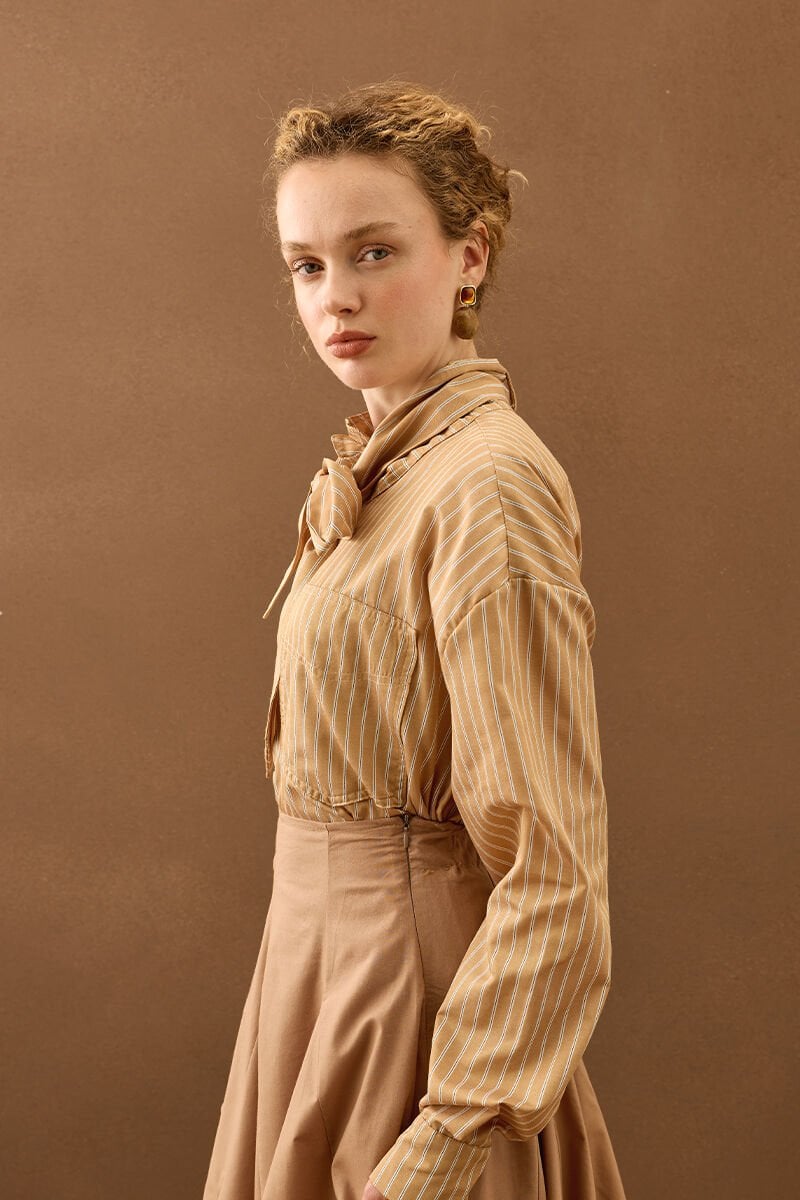 Karamel Çizgili Fularlı Gömlek