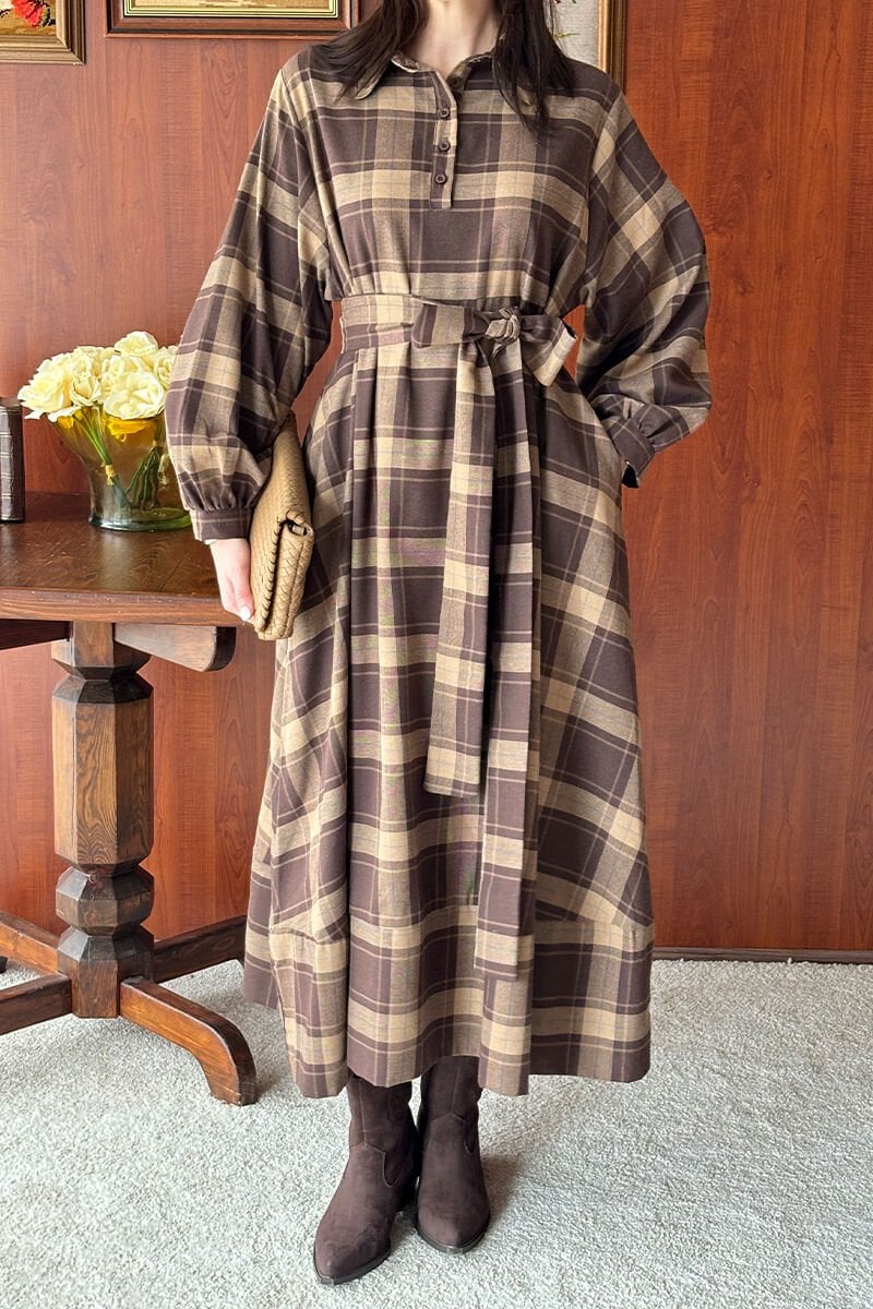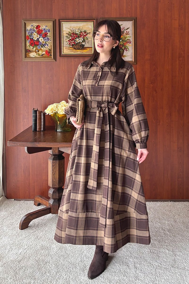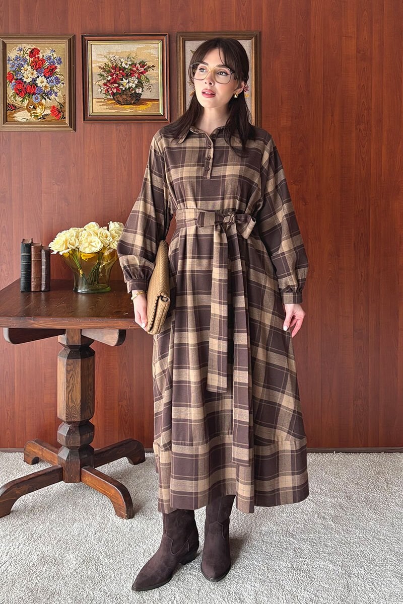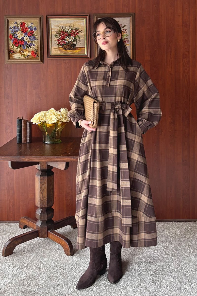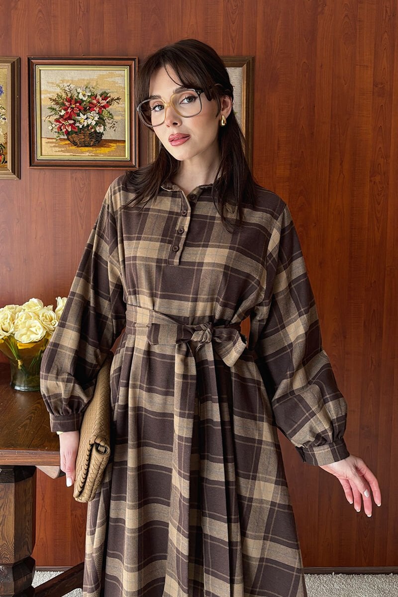 Karamel Ekoseli Vintage Elbise