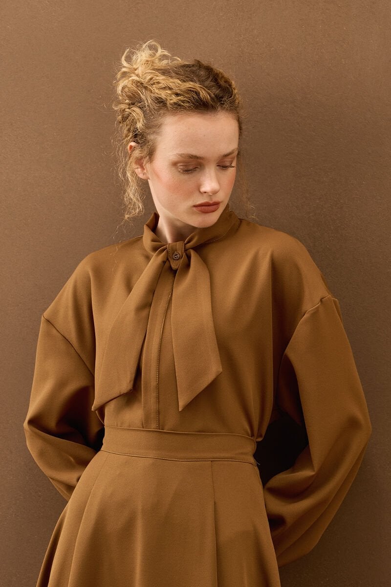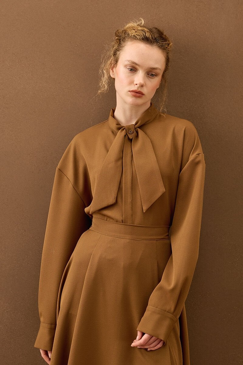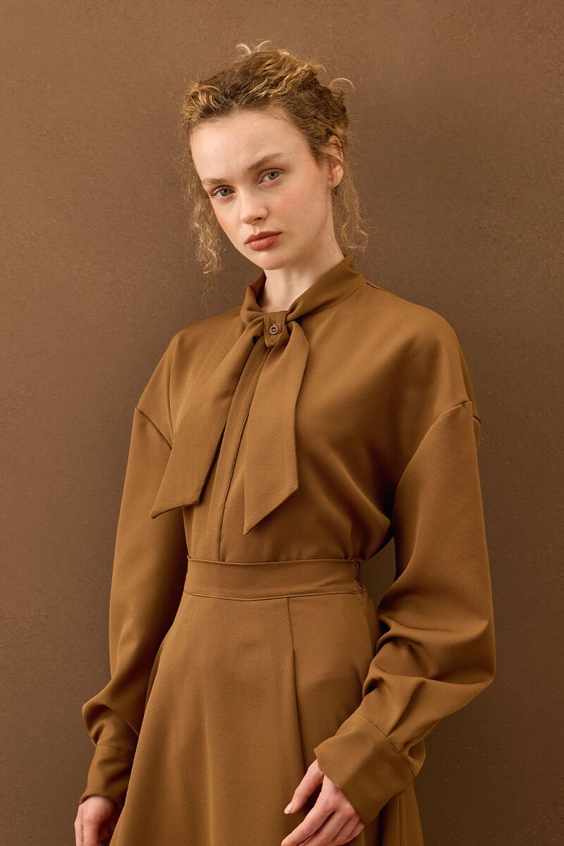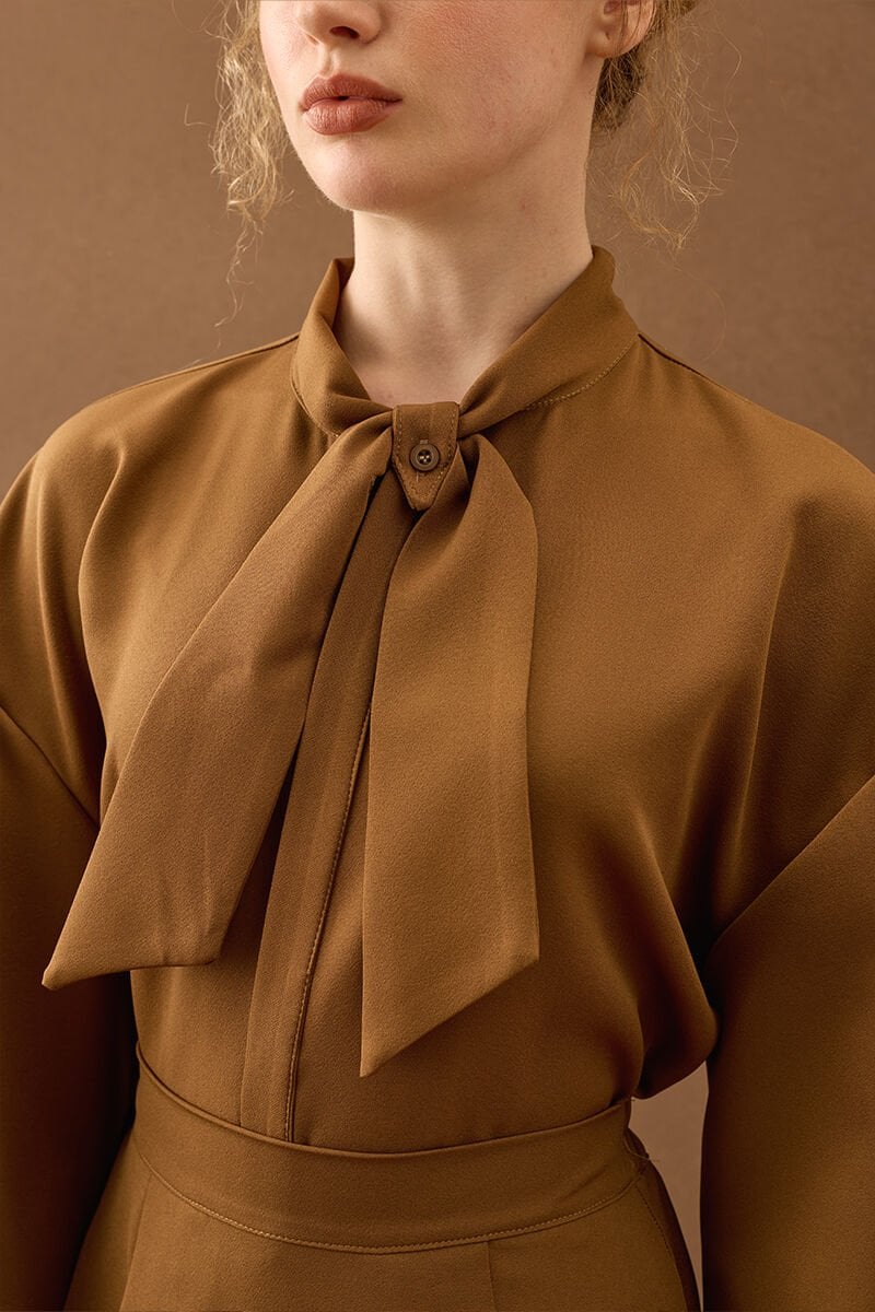 Tozlu Kahve Yakası Fiyonklu Krep Gömlek