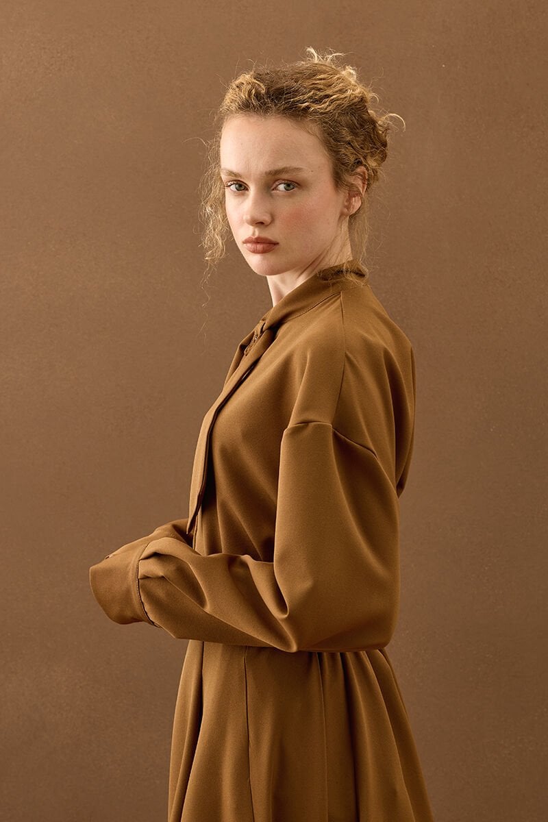 Karamel Yakası Fiyonklu Krep Gömlek