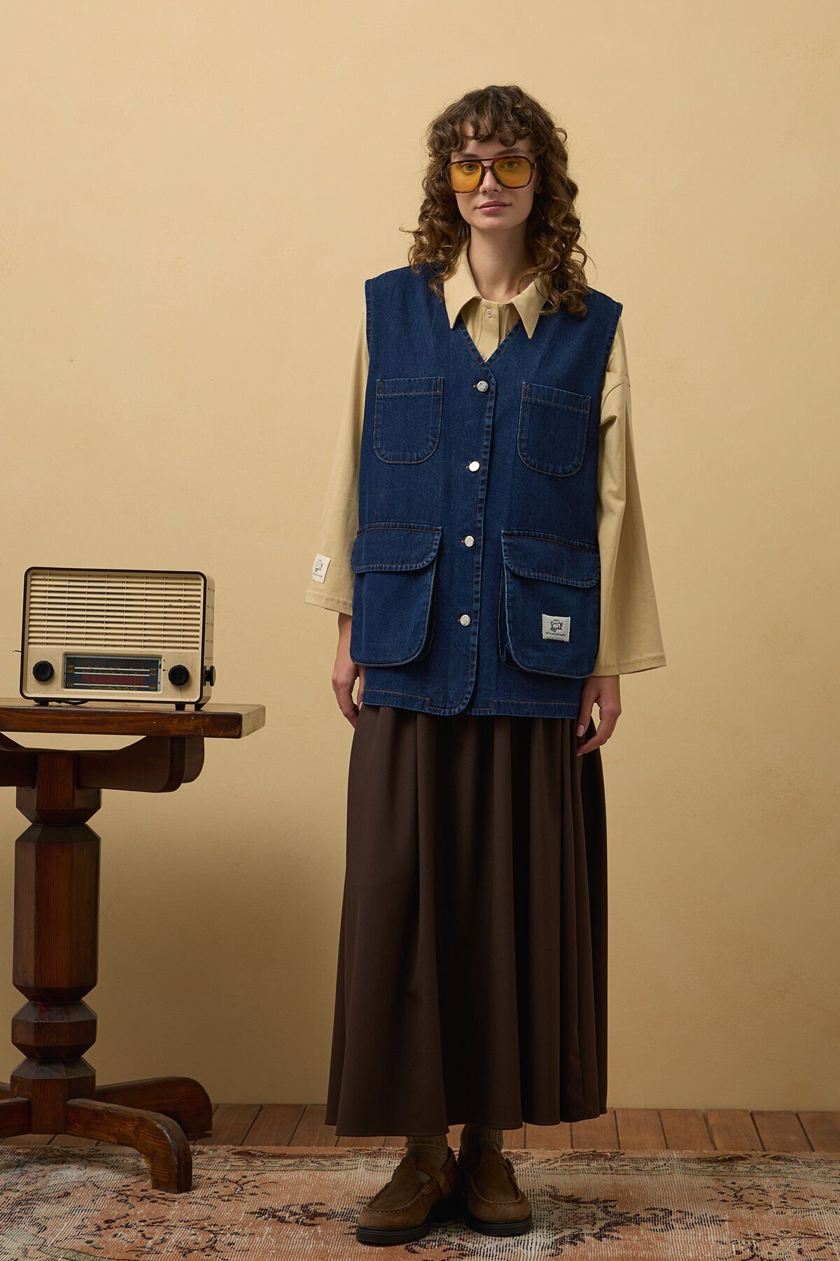 Bu kargo cepli kot yelek, hem şık hem de kullanışlıdır.