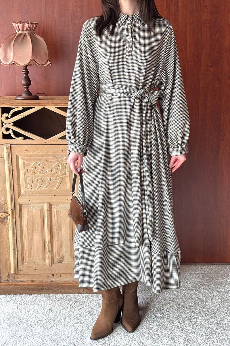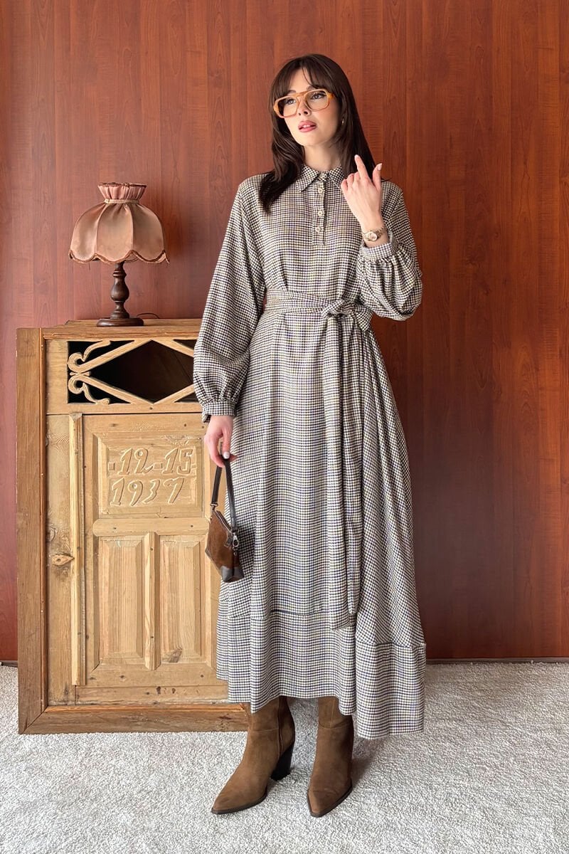 Şık ve zamansız ekose desenli elbisemiz, düğme detaylarıyla dikkat çekiyor.