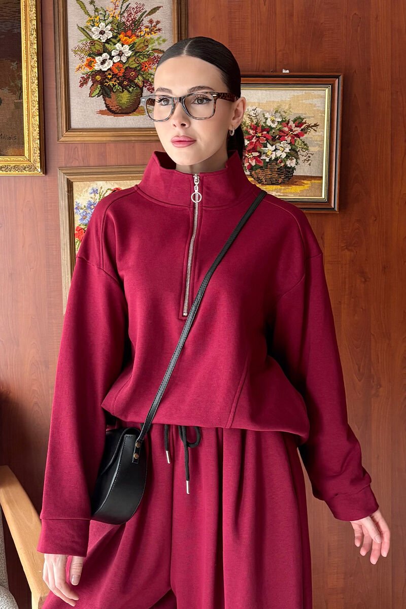 Bordo 3 İplik Yarım Fermuarlı Sweat