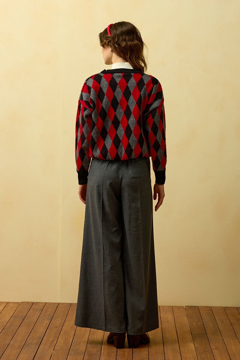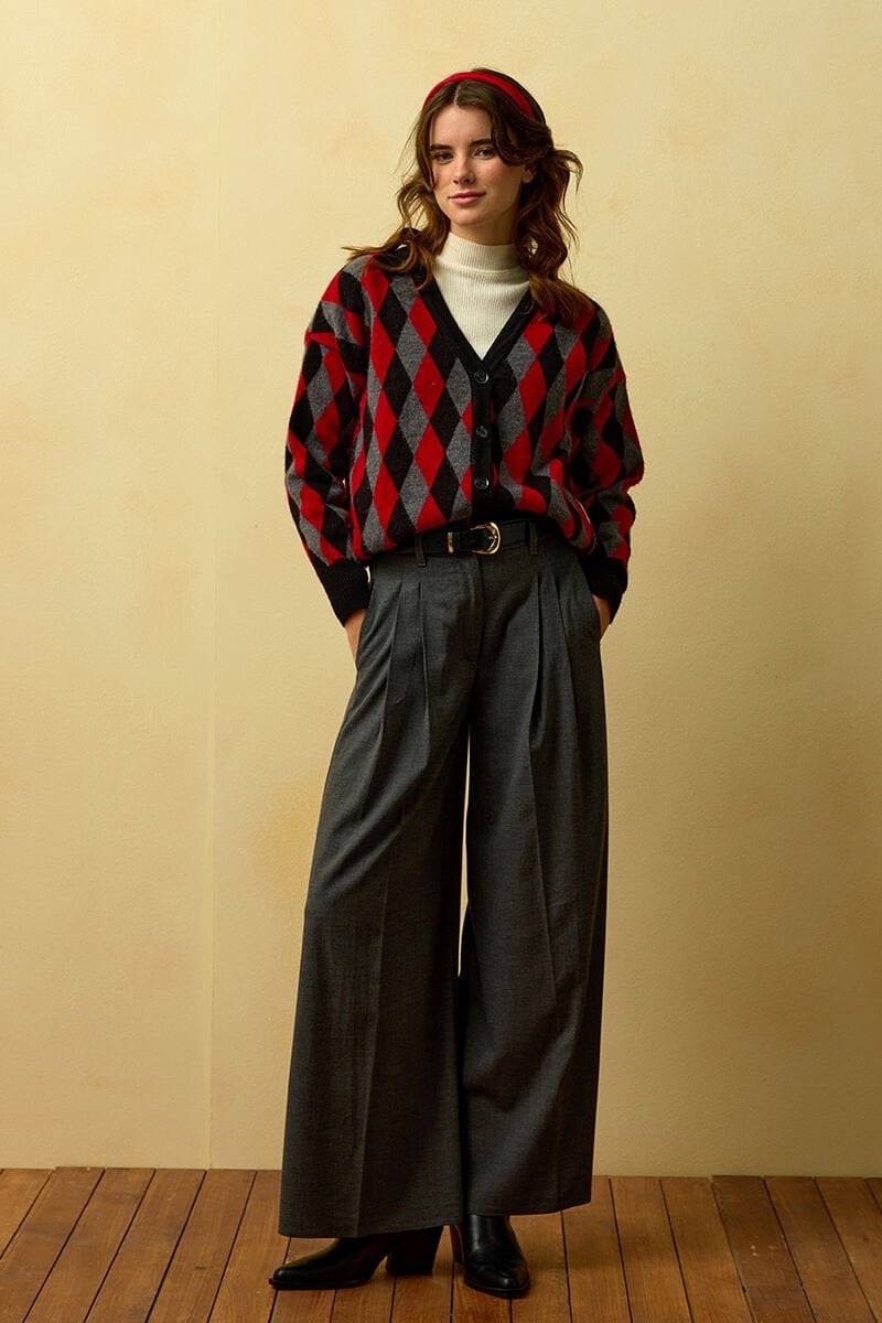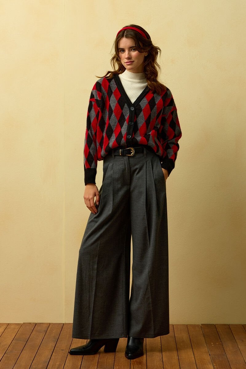Kırmızı Baklava Desenli Triko Hırka & Antrasit Pile Detay Palazzo Pantolon