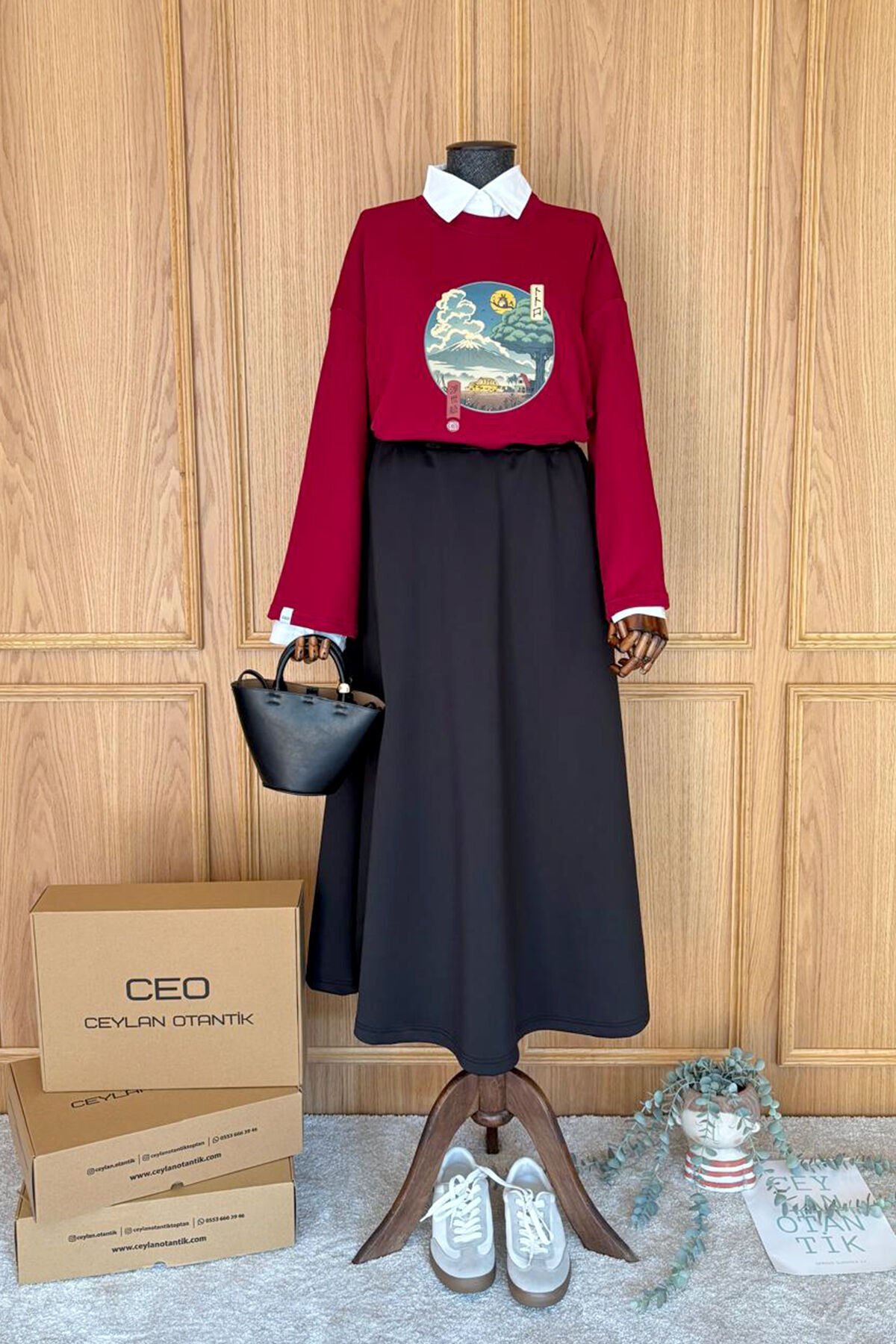 Bordo Baskılı 3 İp Body & Siyah Scuba Etek Takım