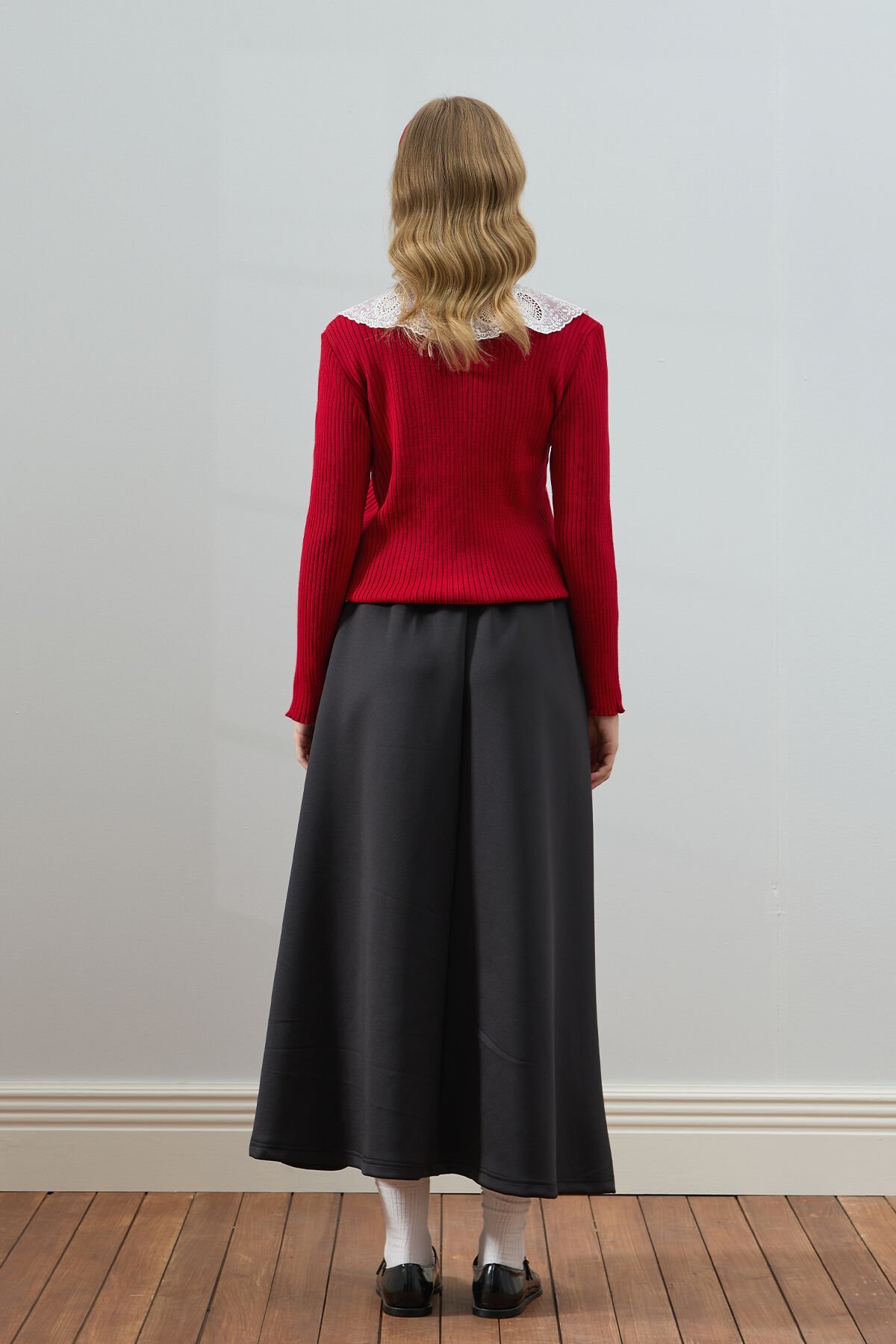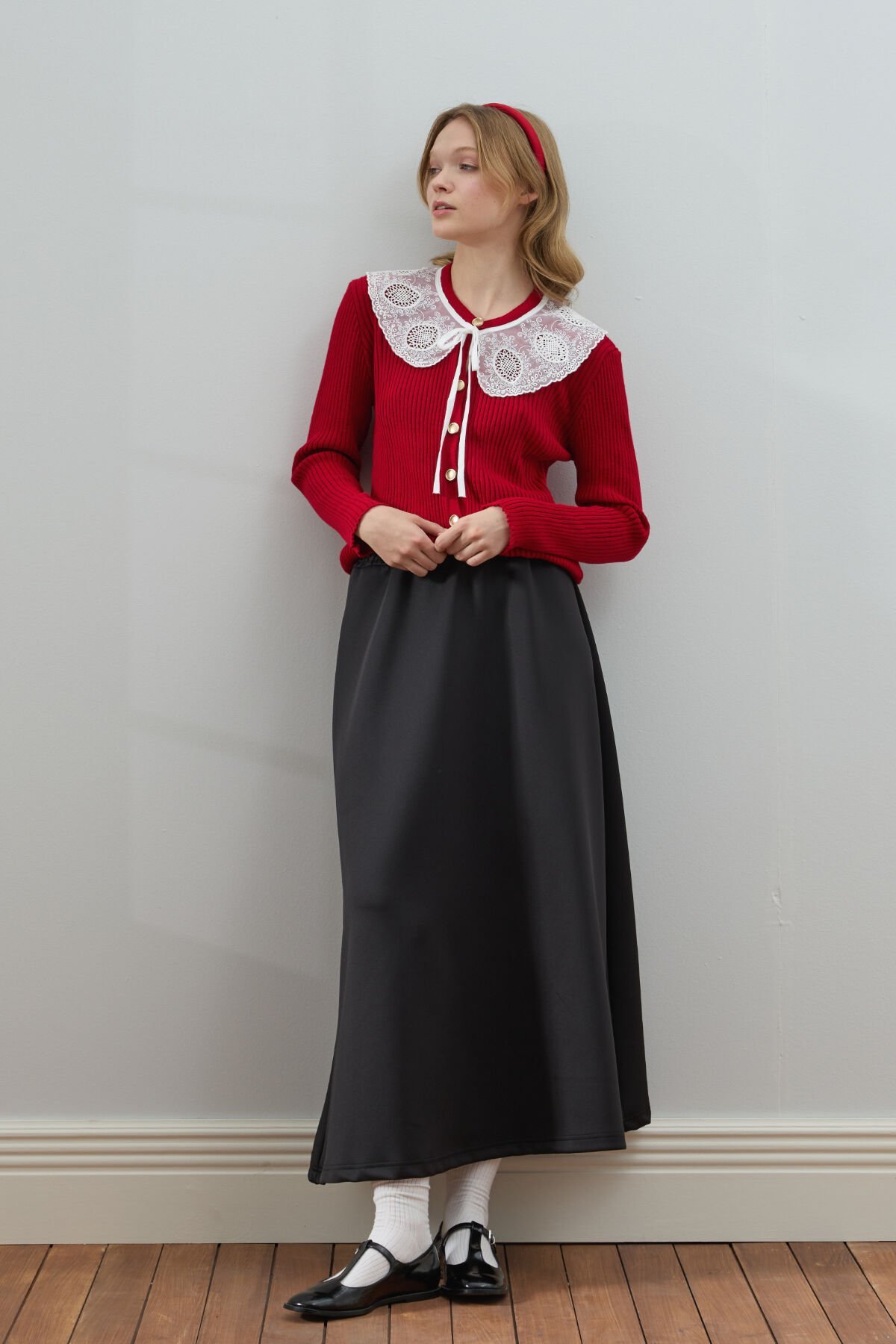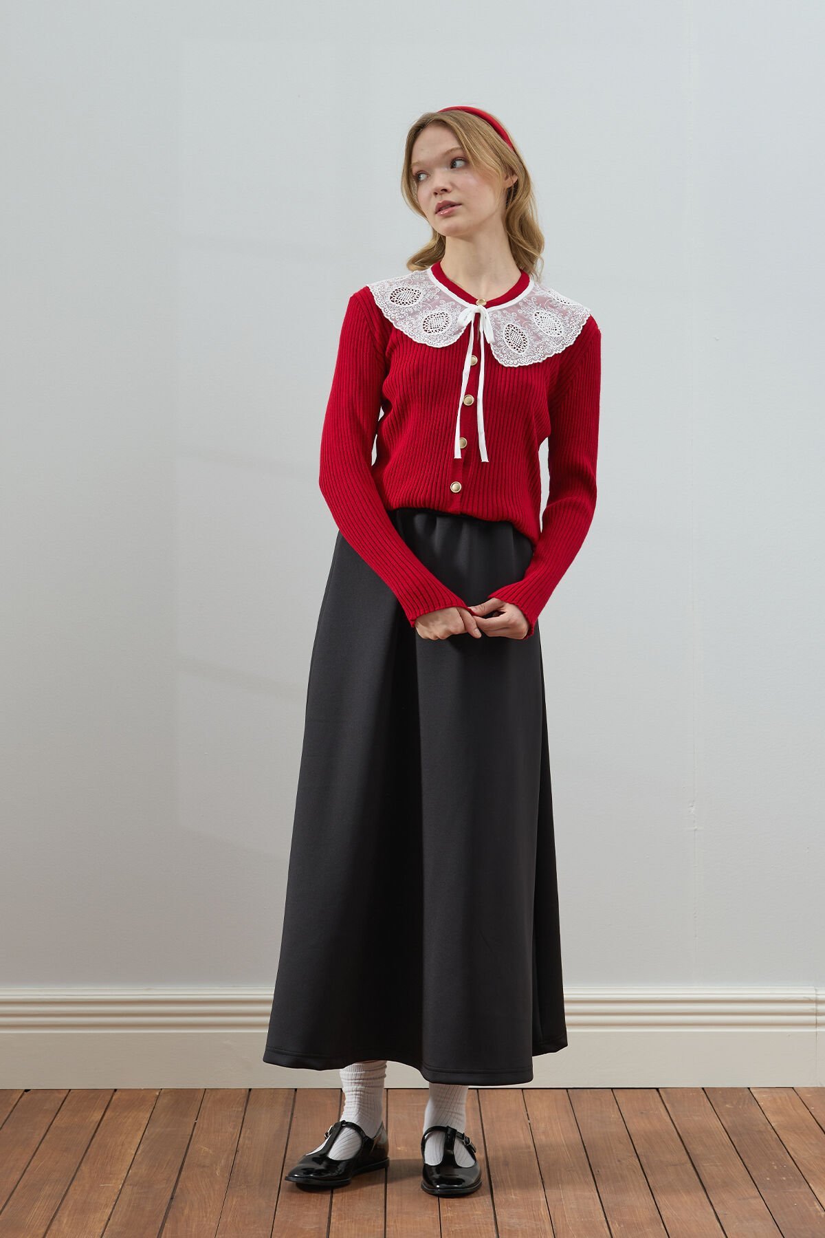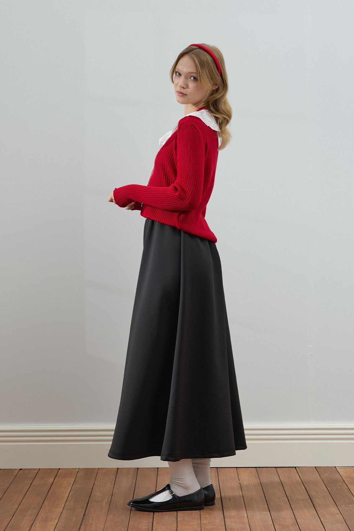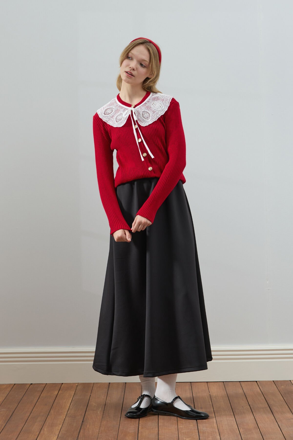 Kırmızı Beyaz Yakalı Triko Hırka & Siyah Scuba Etek Takım