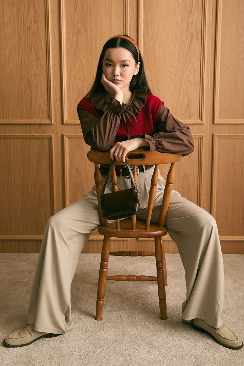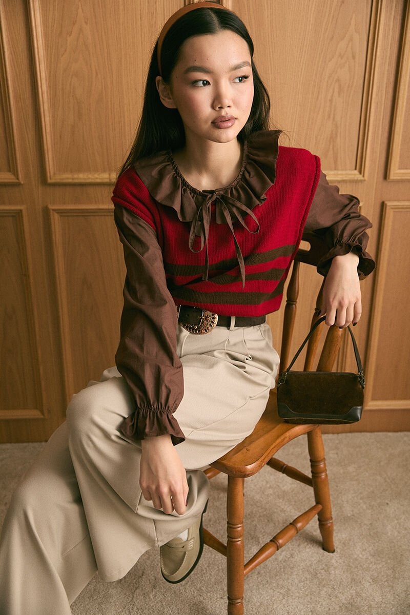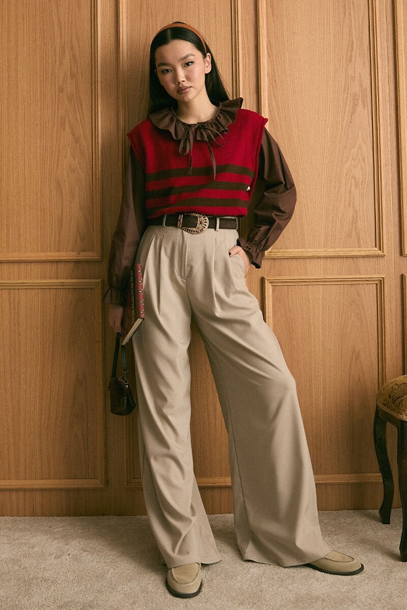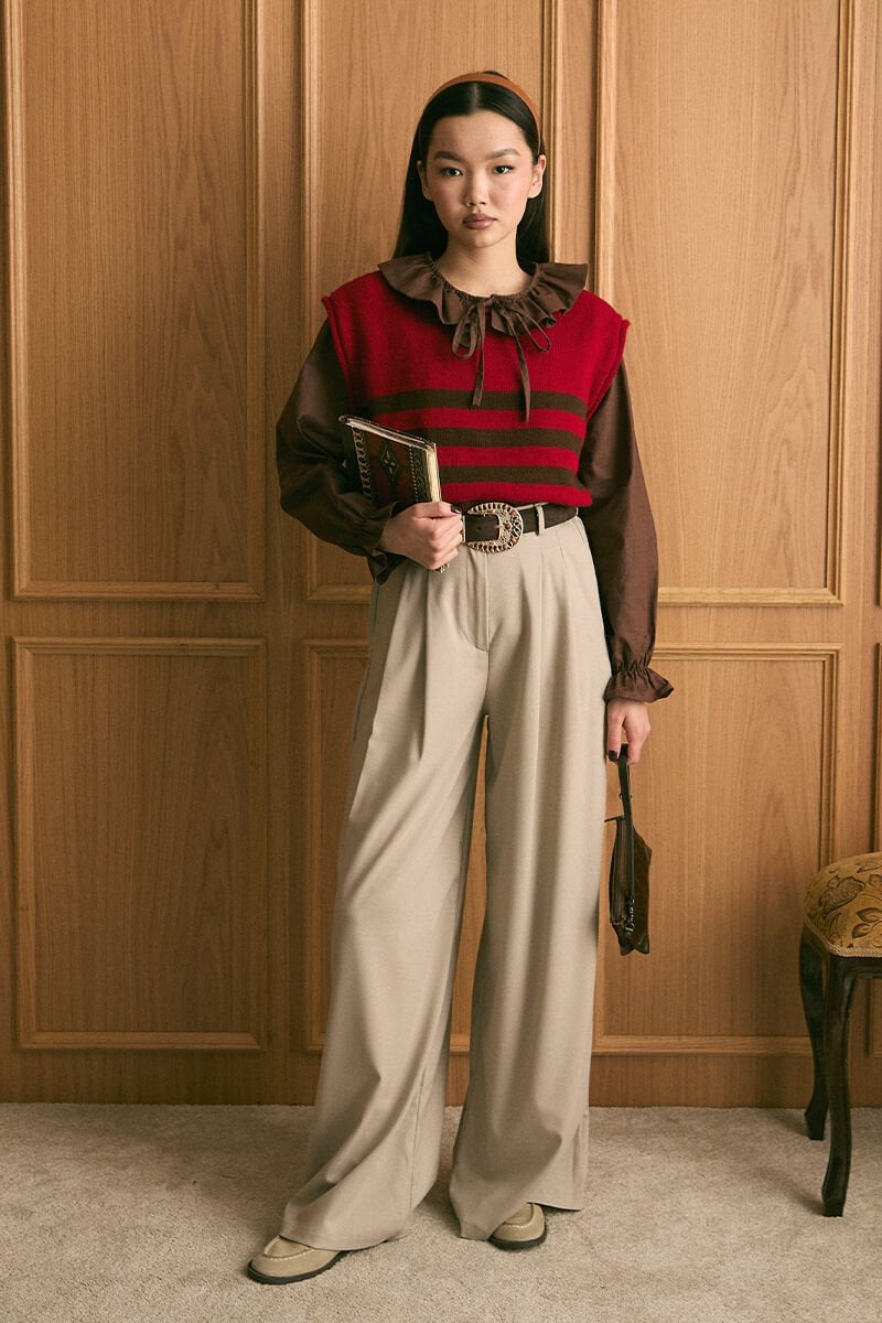 Kırmızı Çizgi Detaylı Süveter & Vizon Pile Detay Palazzo Pantolon Takım