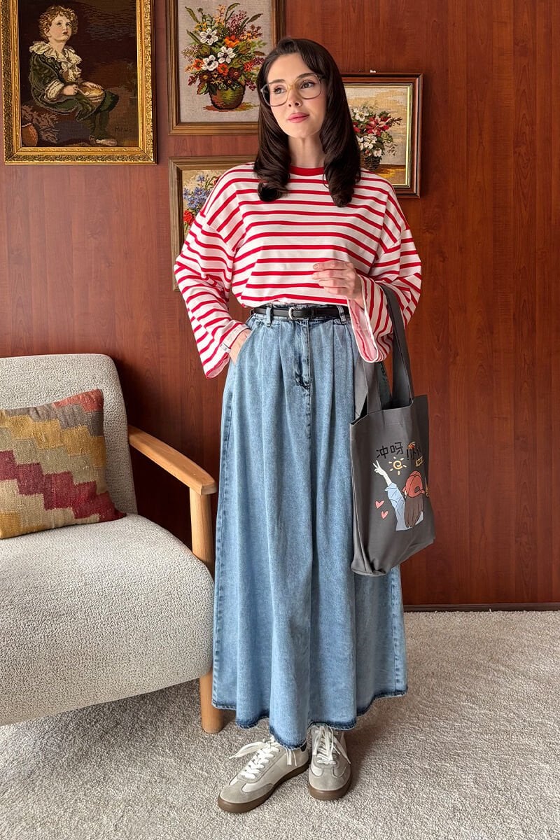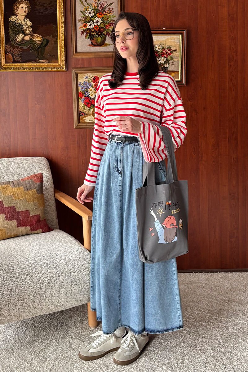 Kırmızı Çizgili Body & Buz Mavisi Tek Düğmeli Etek Takım