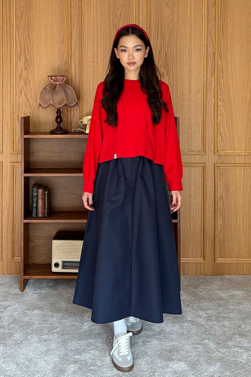 Kırmızı Crop & Lacivert Keten Tek Düğmeli Etek Takım