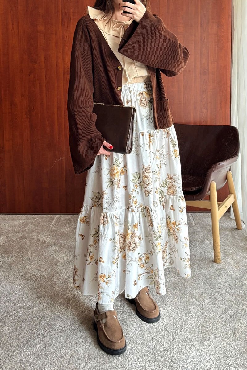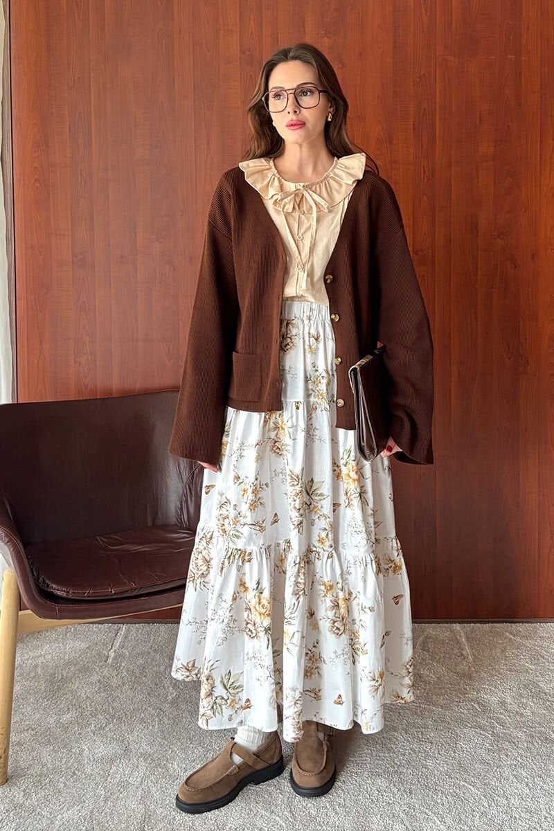 Krem Çiçekli Kat Kat Etek