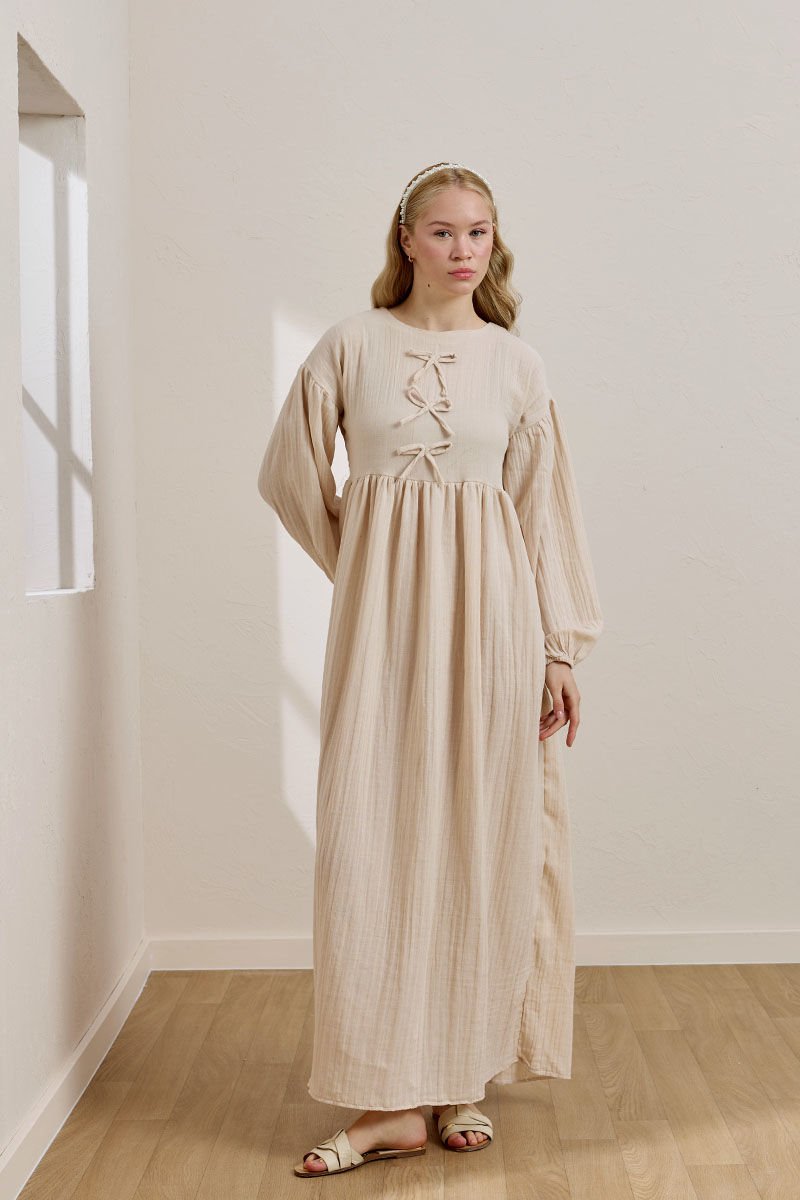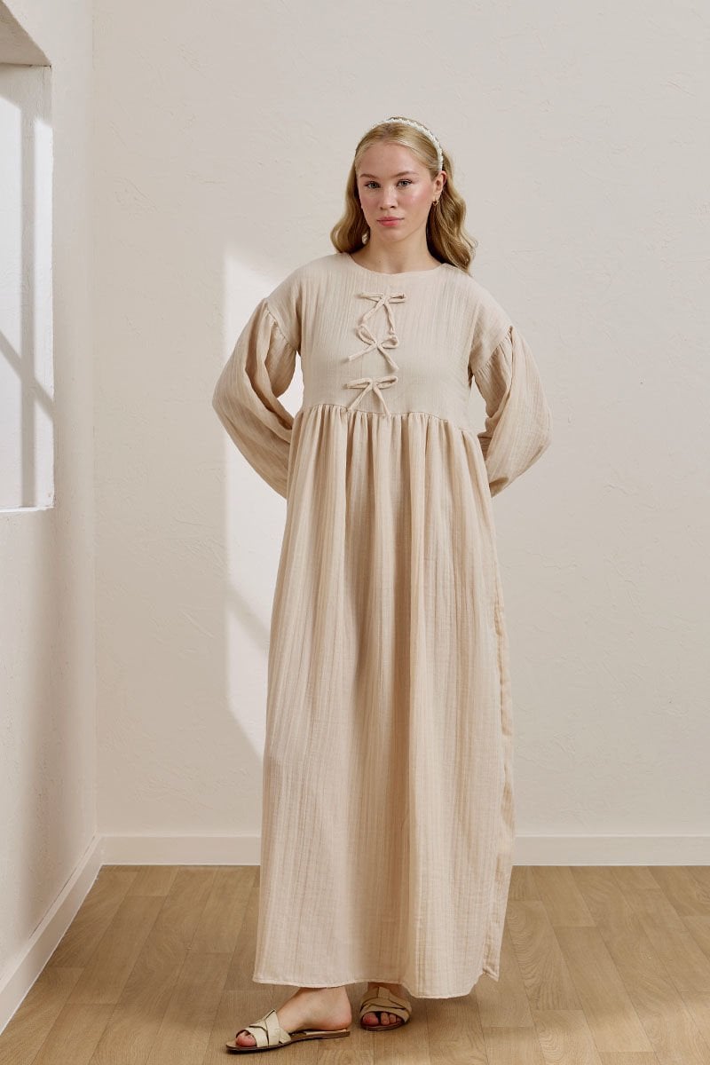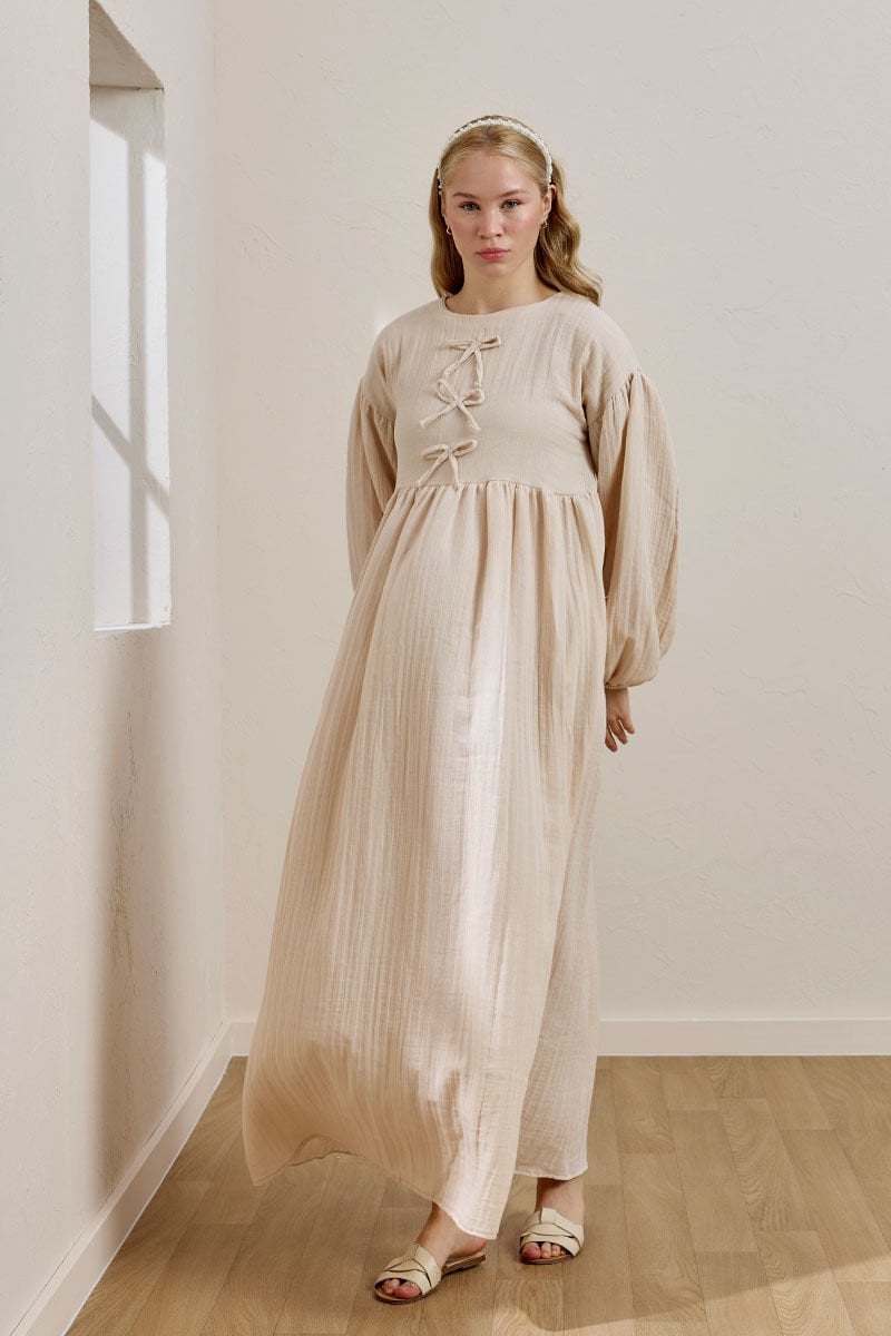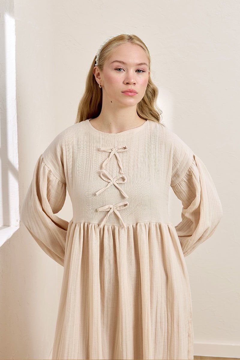 Krem Müslin Fiyonklu Belroba Elbise