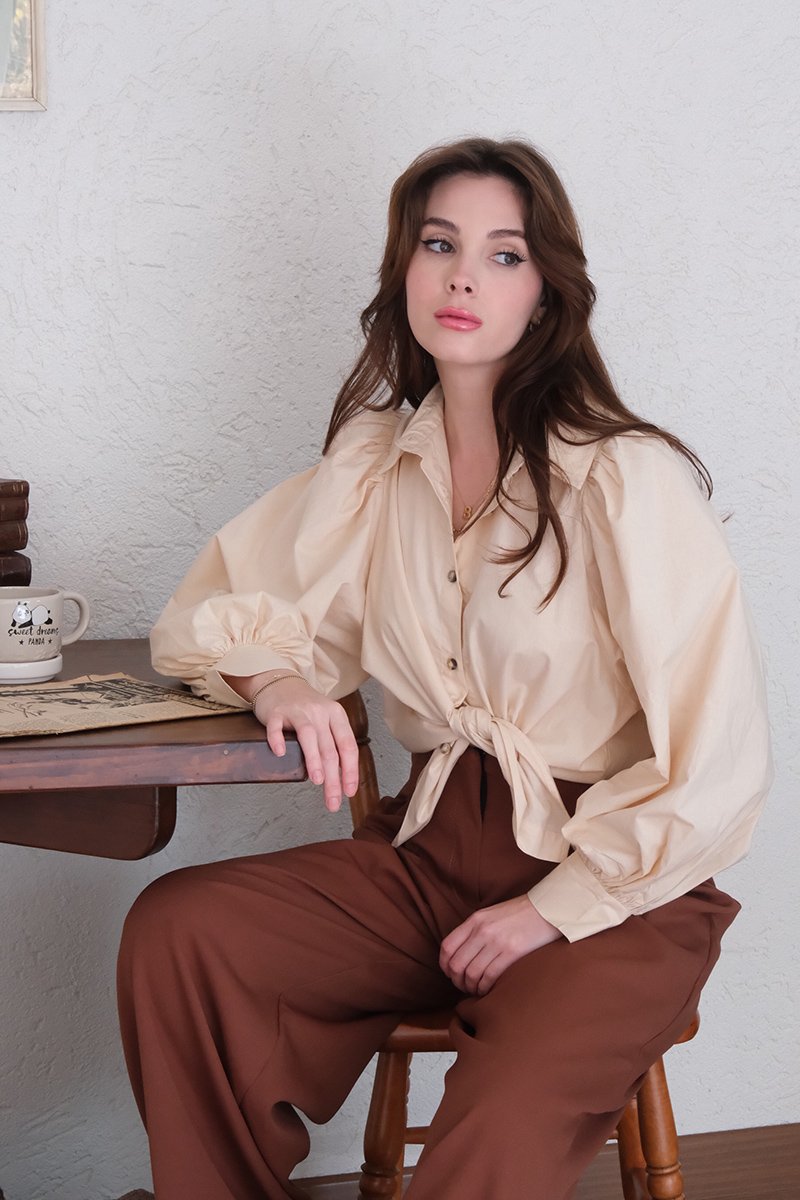 Krem Klasik Yaka Crop Gömlek