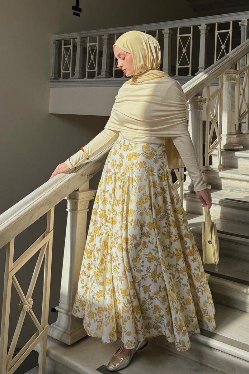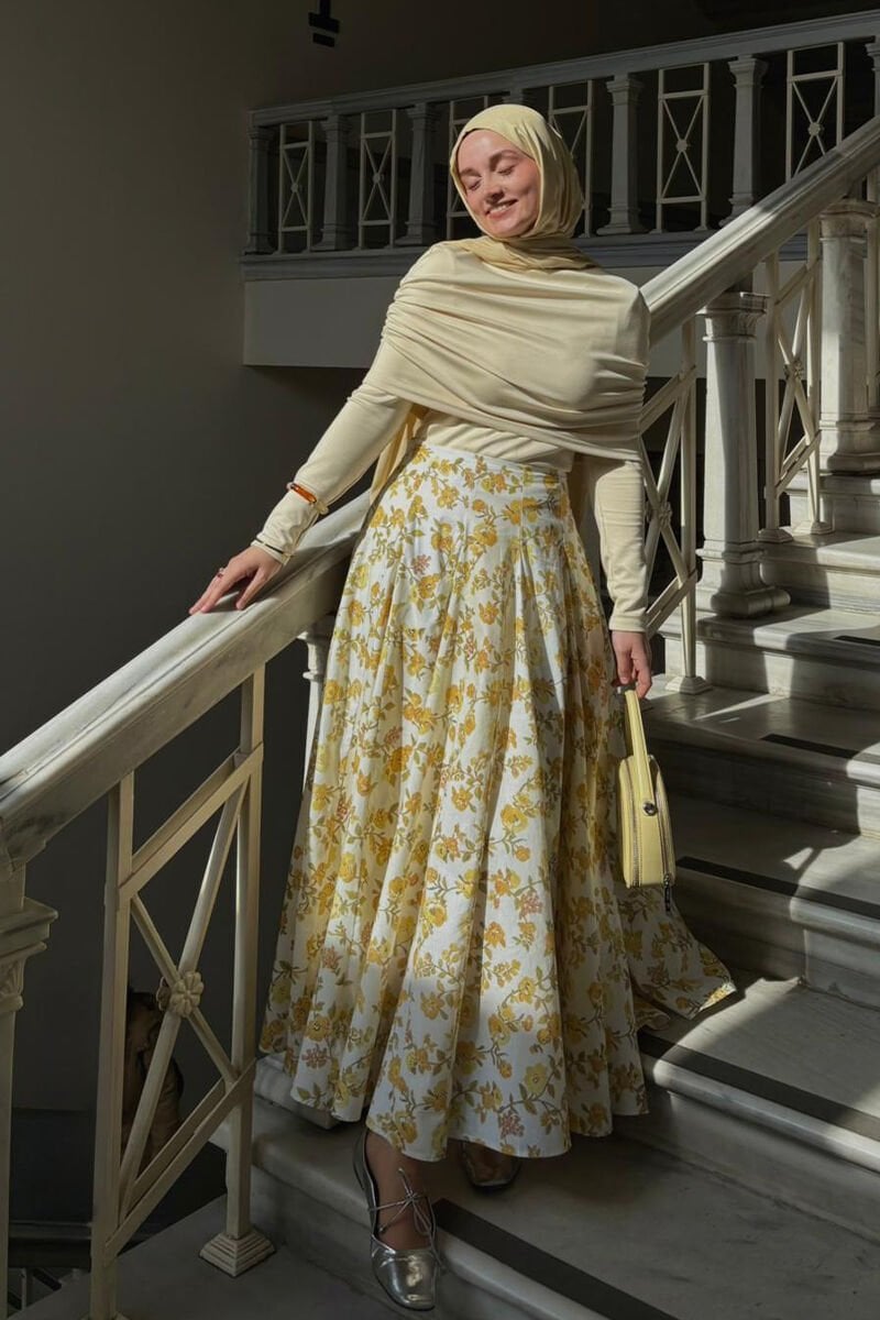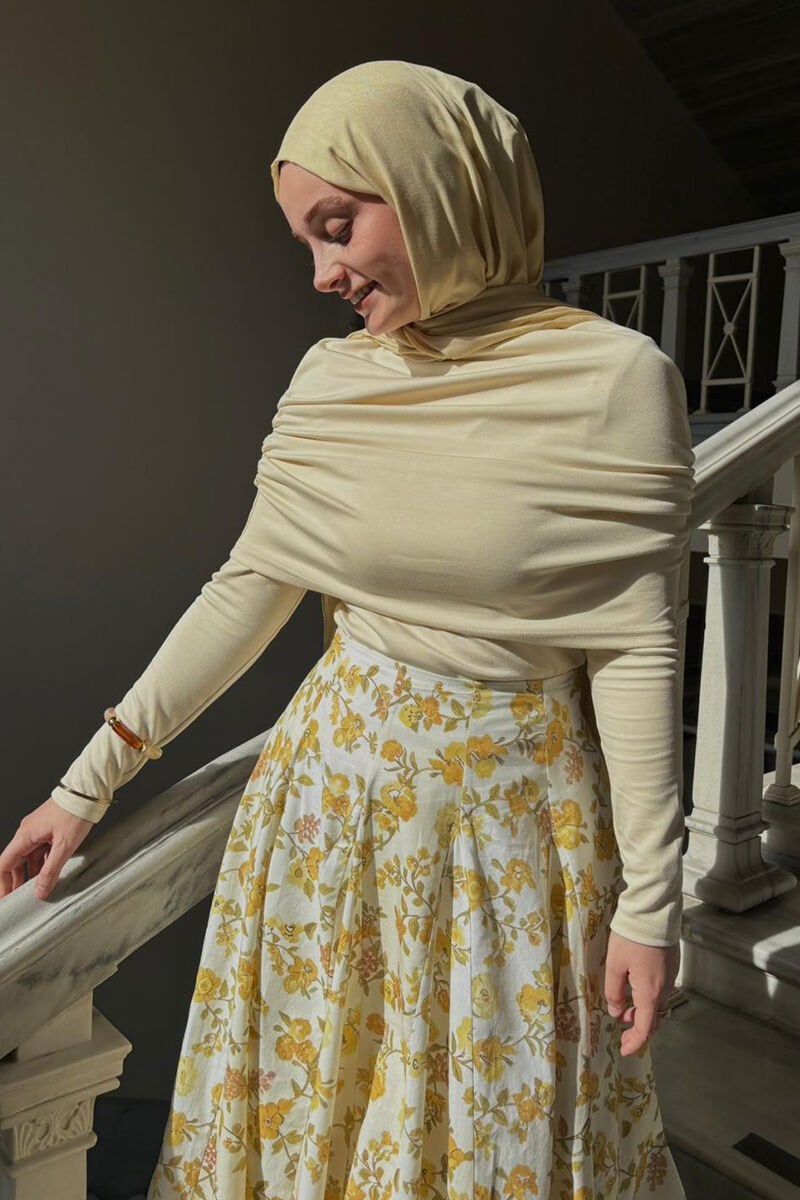 Krem Oysho Büzgü Detaylı Bluz & Sarı Çiçek Desenli Parçalı Etek Takım