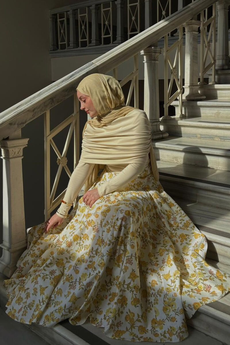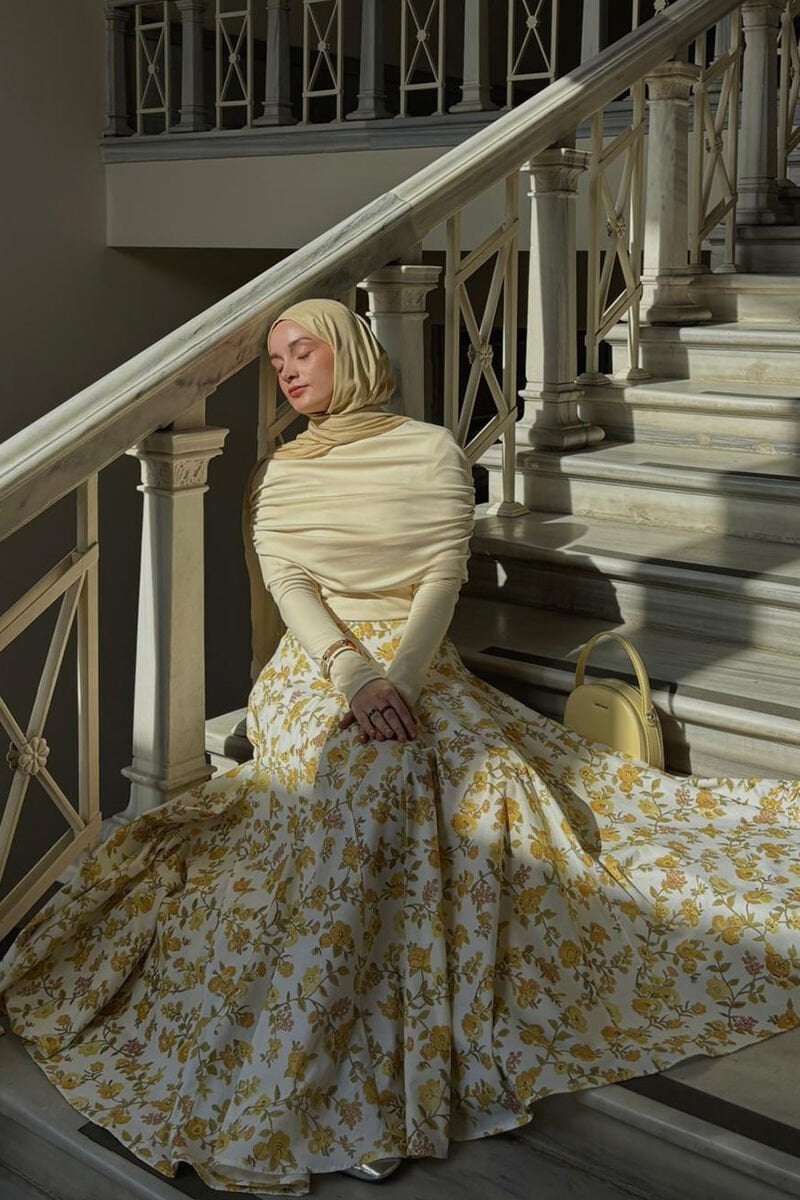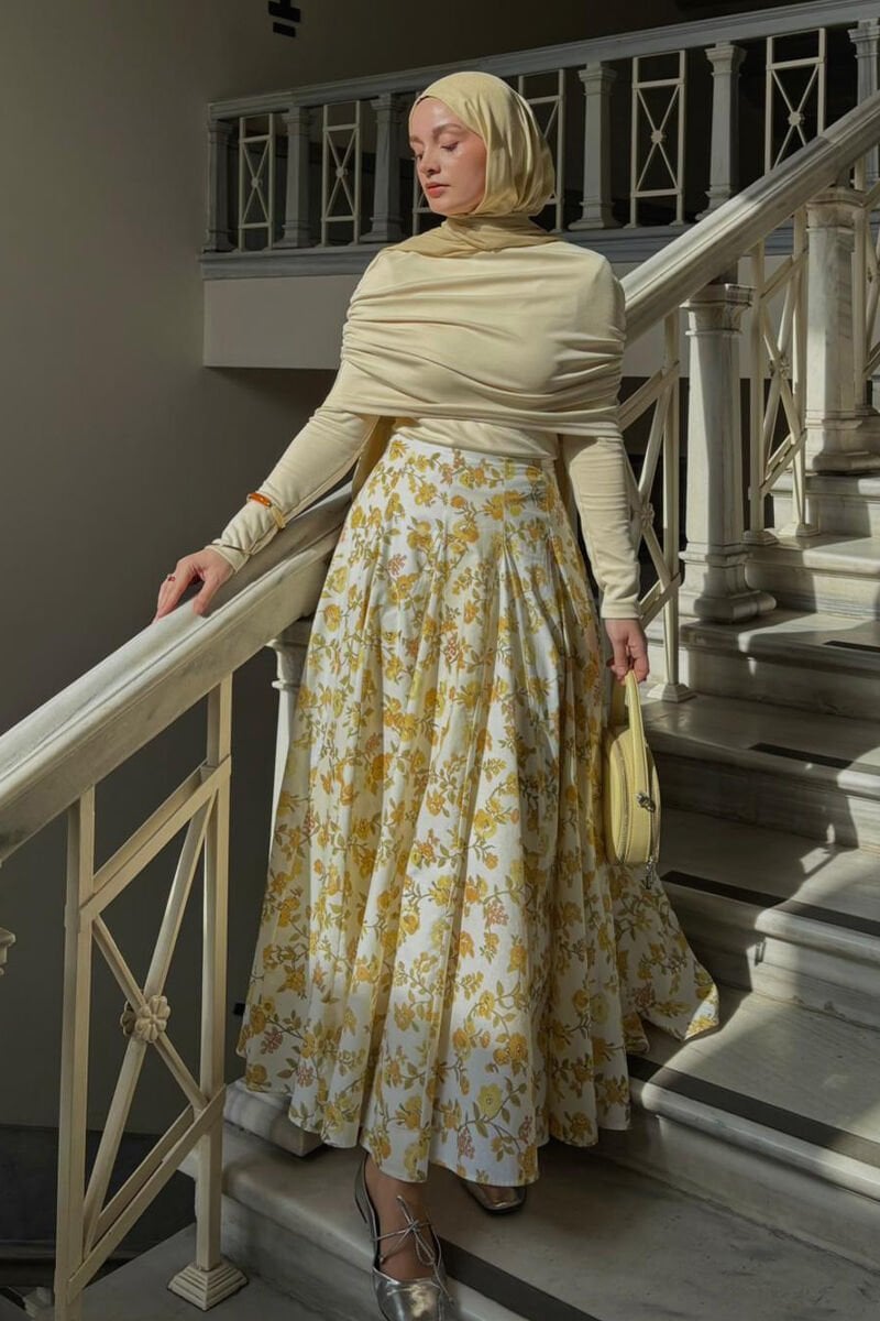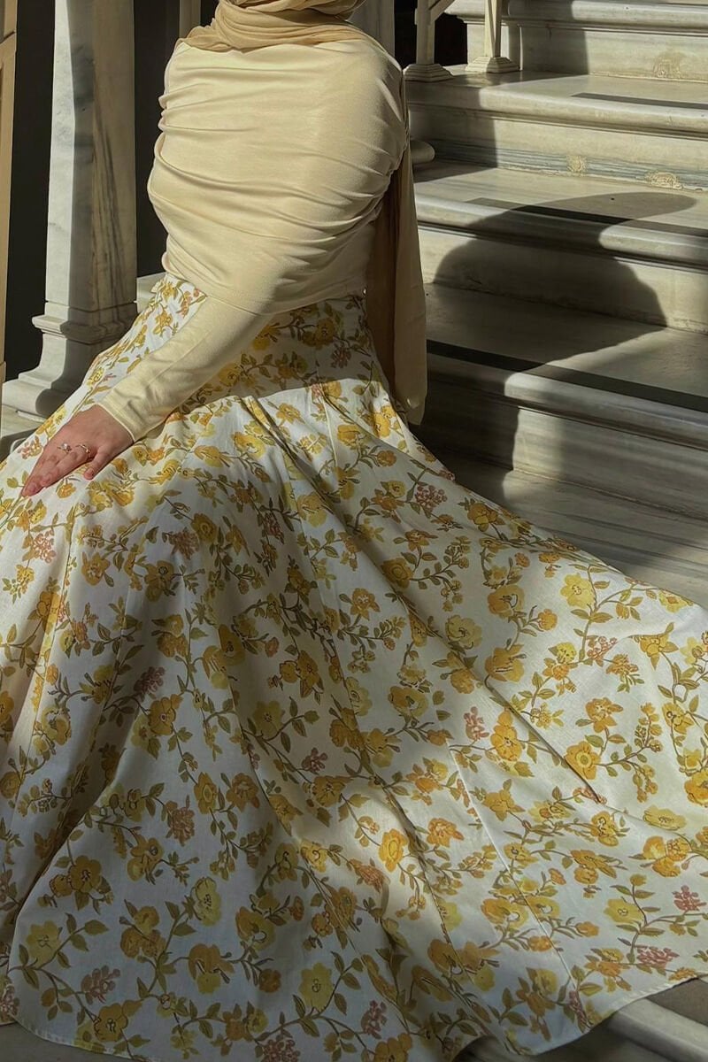 Krem Oysho Büzgü Detaylı Bluz & Sarı Çiçek Desenli Parçalı Etek Takım