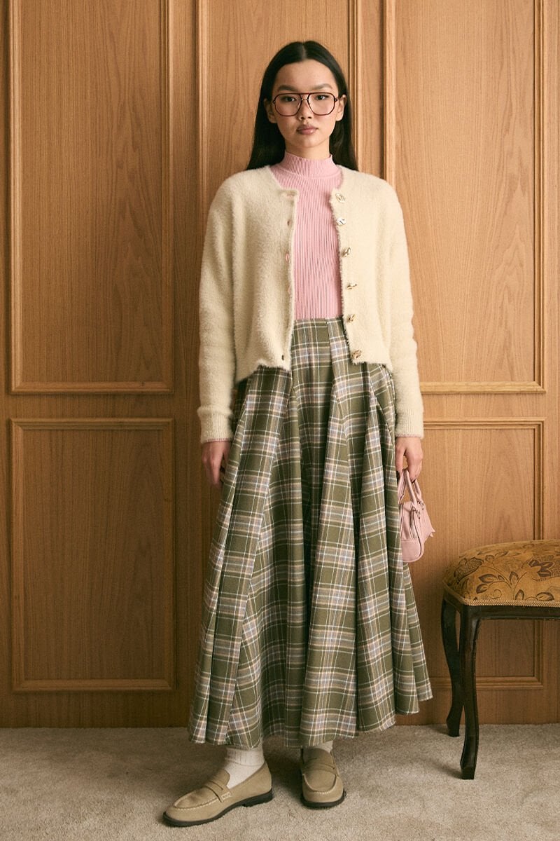 Krem Peluş Hırka & Haki Ekose Parçalı Etek Takım