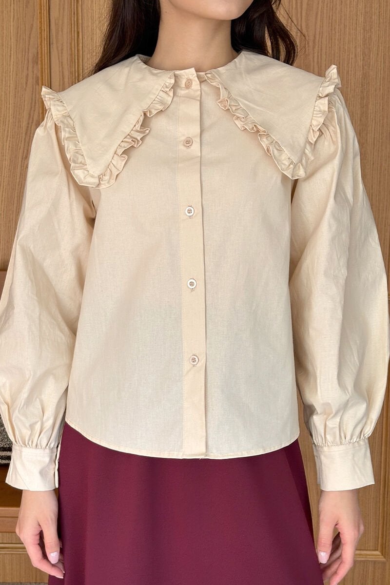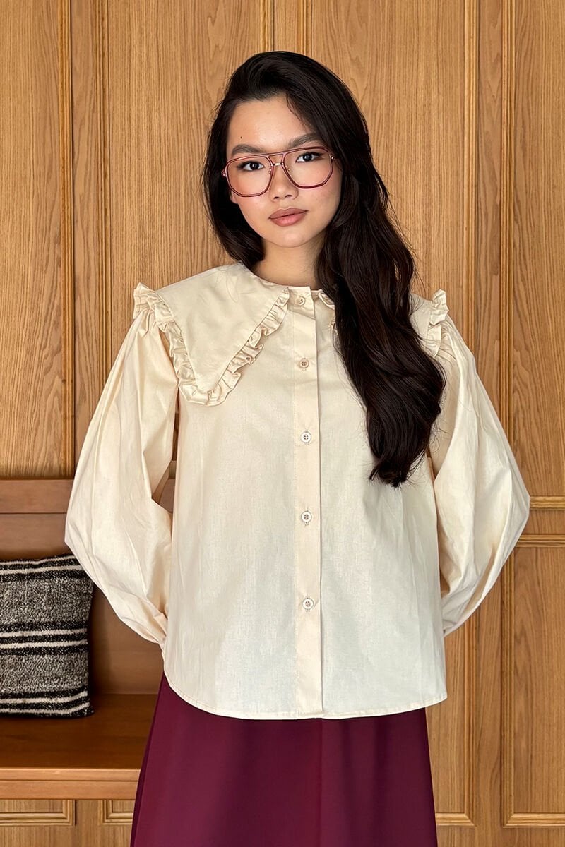 Krem Yakası Fırfırlı Crop Gömlek