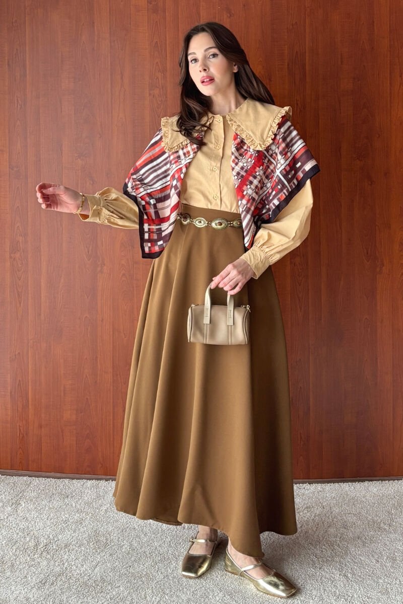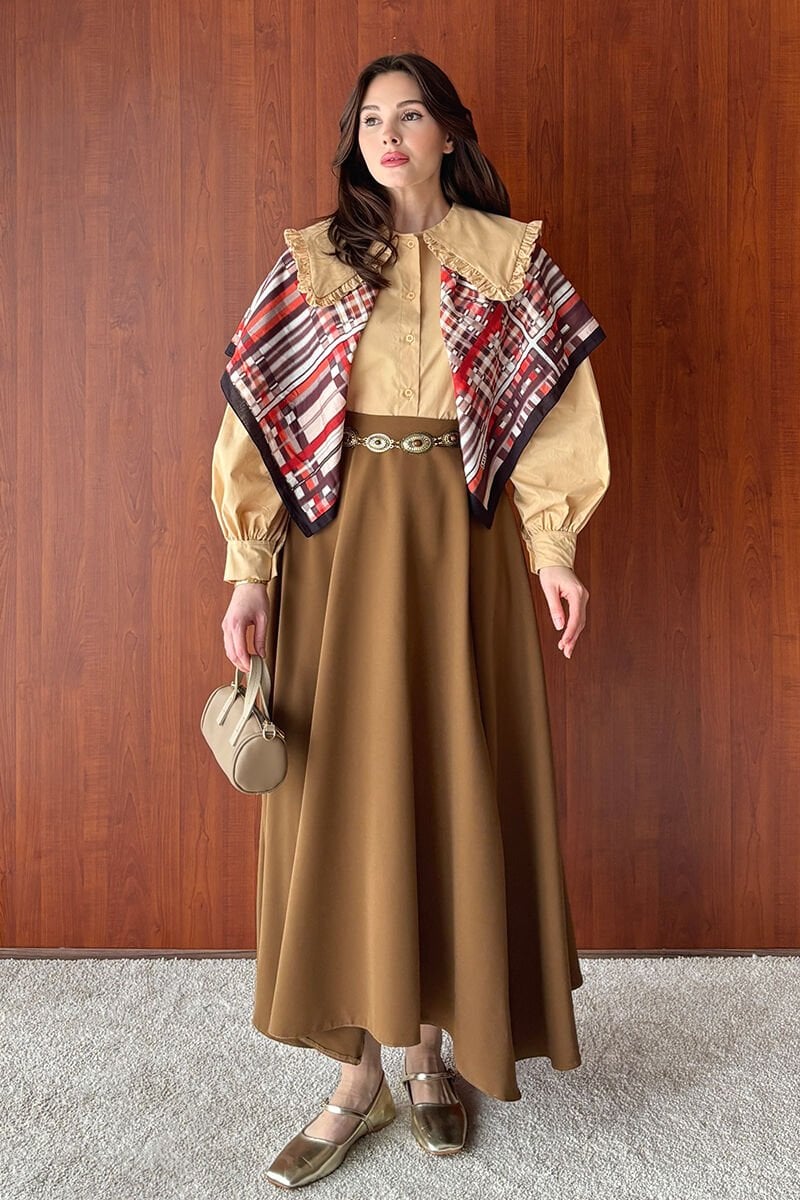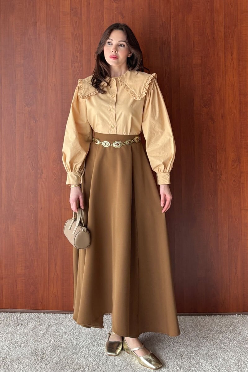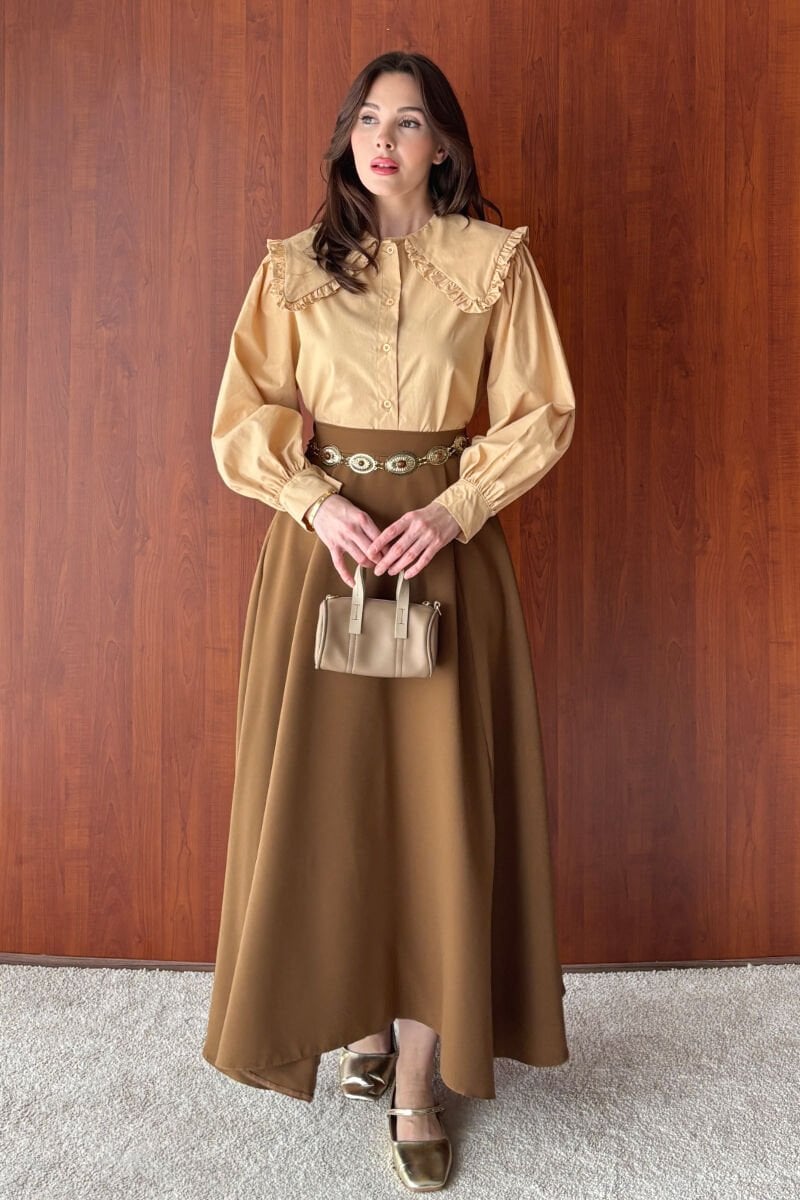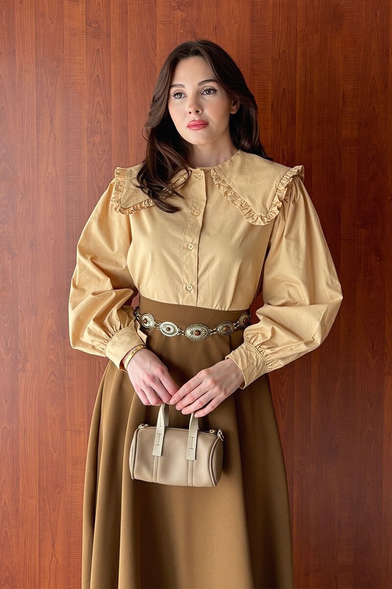 Krem Yakası Fırfırlı Crop Gömlek