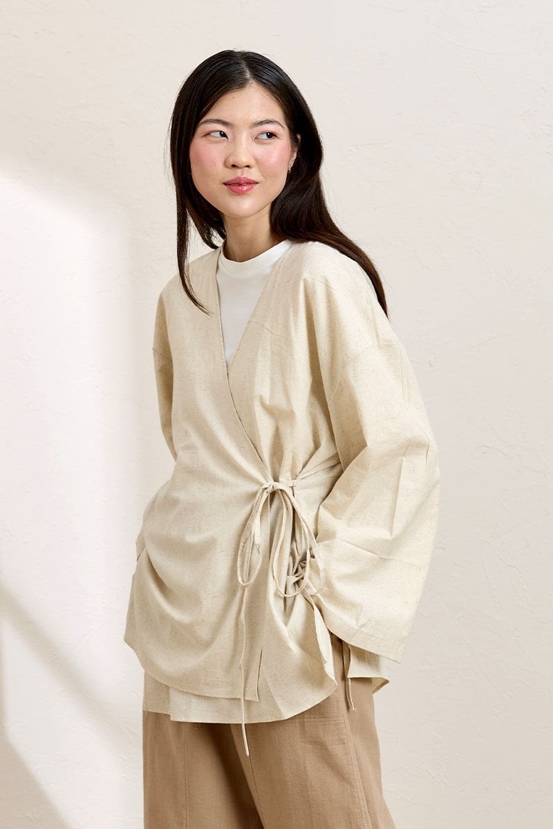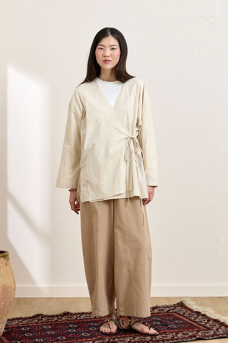 Krem Organik Keten Bağlamalı Tunik & Karamel Şalvar Pantolon Takım
