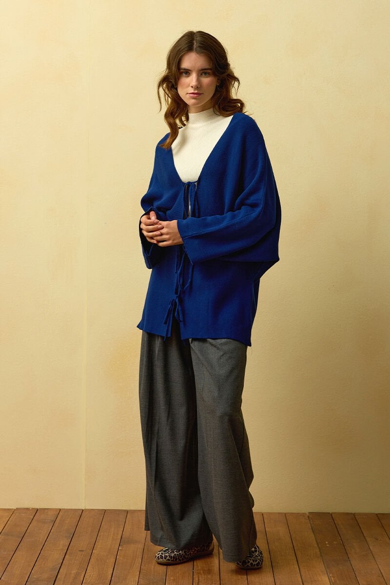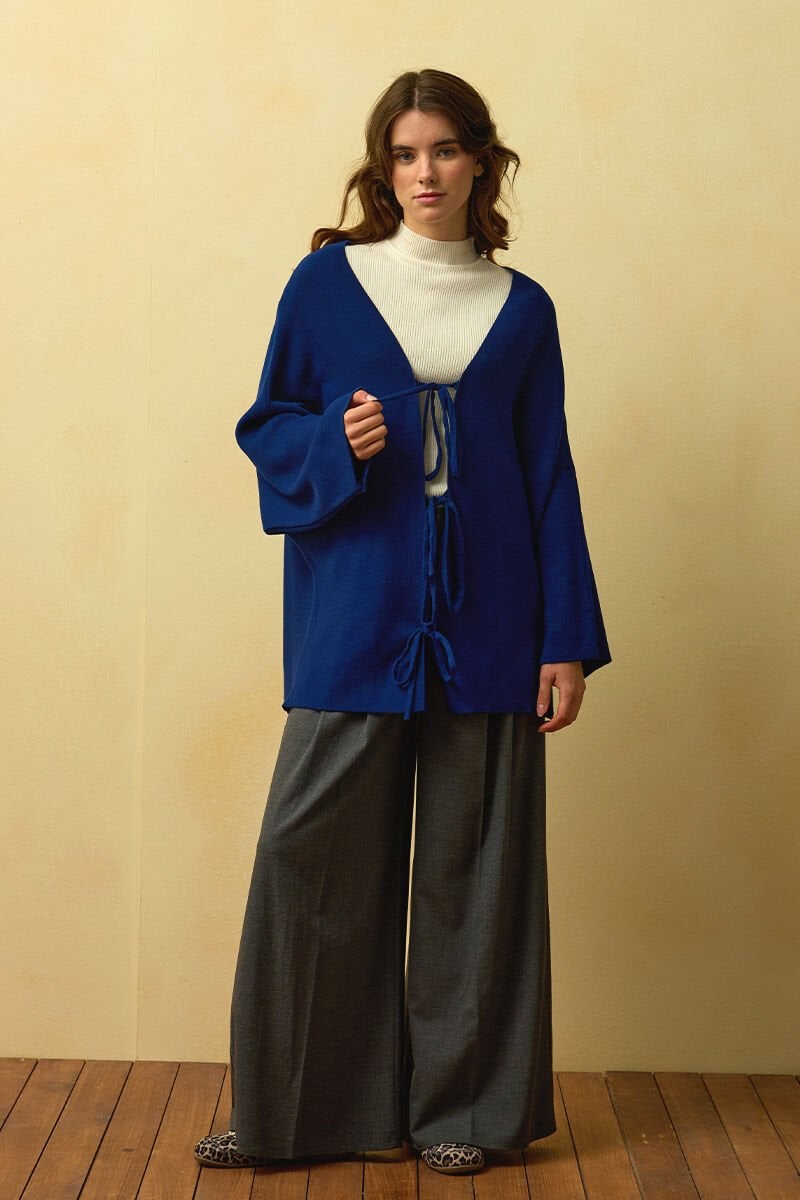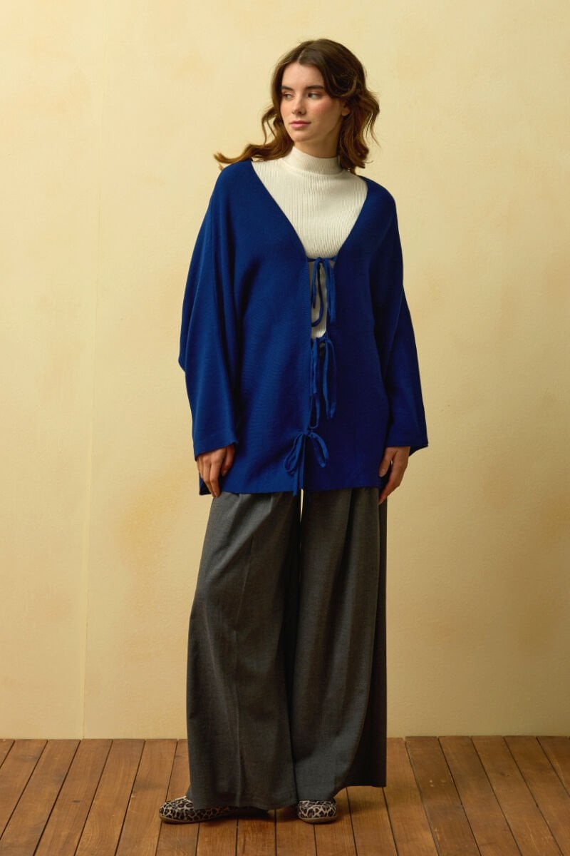 Modern şıklığı yakalayan triko fiyonklu ceket, zarif detaylarıyla dikkat çeker.
