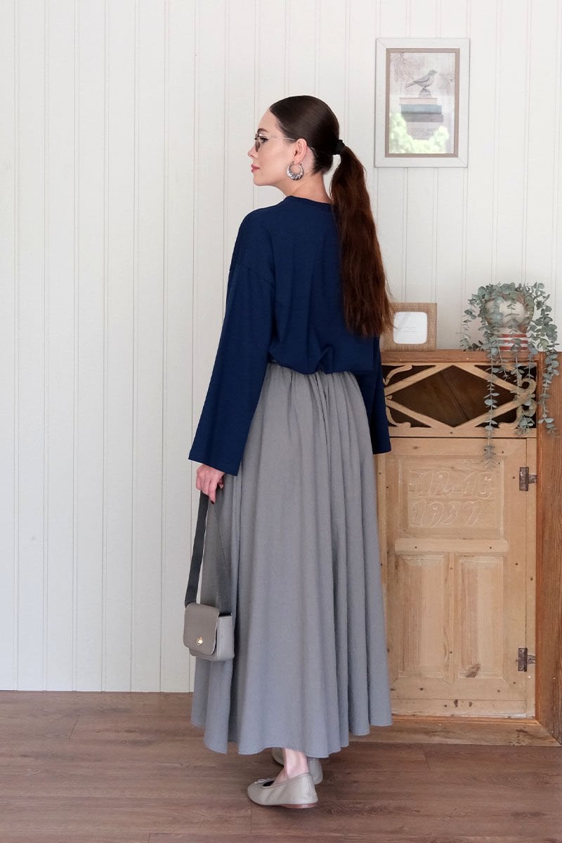 Yumuşak ve doğal organik keten kumaştan üretilmiş olan bu etek rahat ve şık bir görünüm sunar.