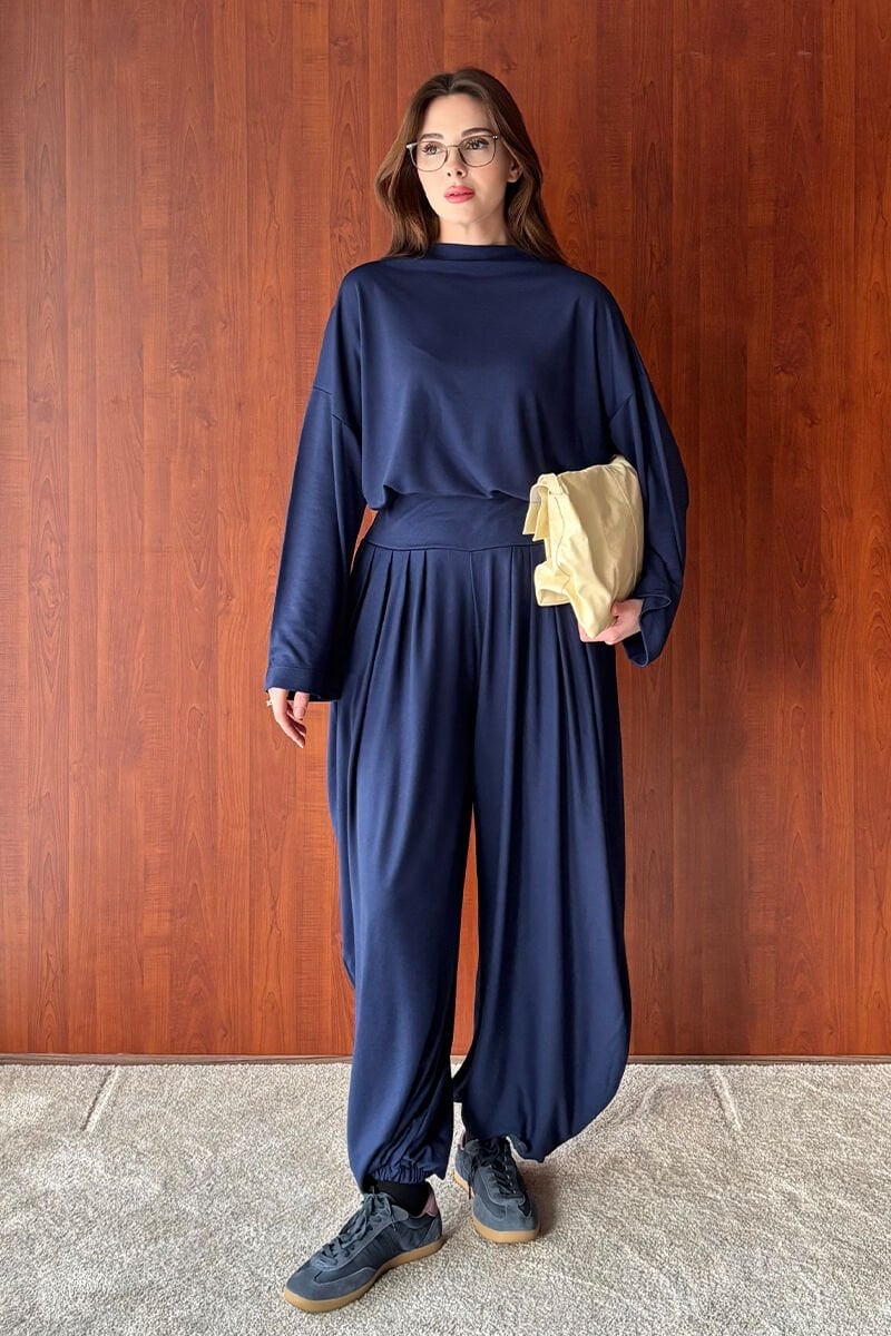 Lacivert Oysho Kumaş Pileli Şalvar Takım