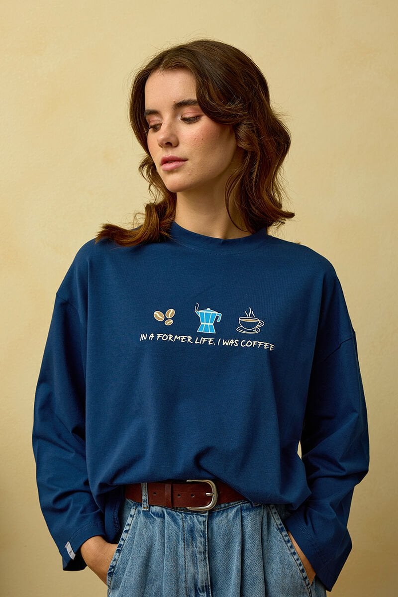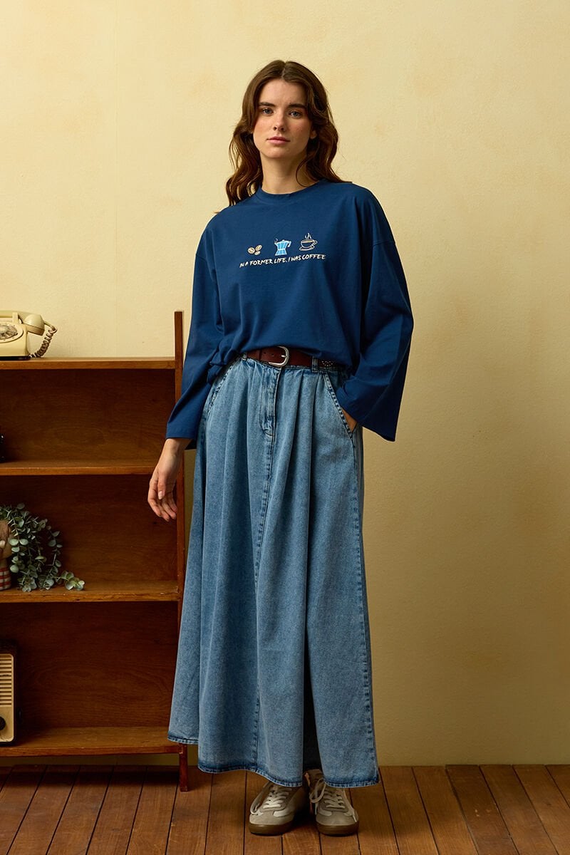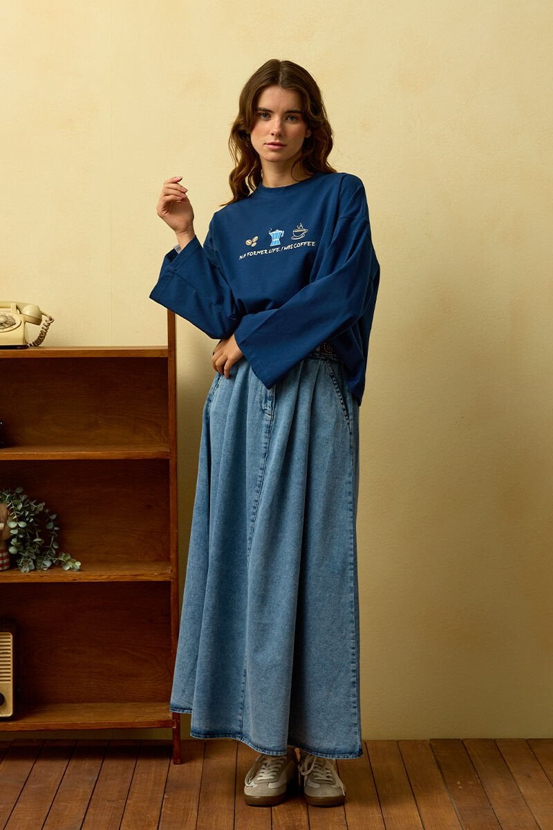 Lacivert Coffee Baskılı Basic Body & Buz Mavi Kot Tek Düğmeli Etek Takım