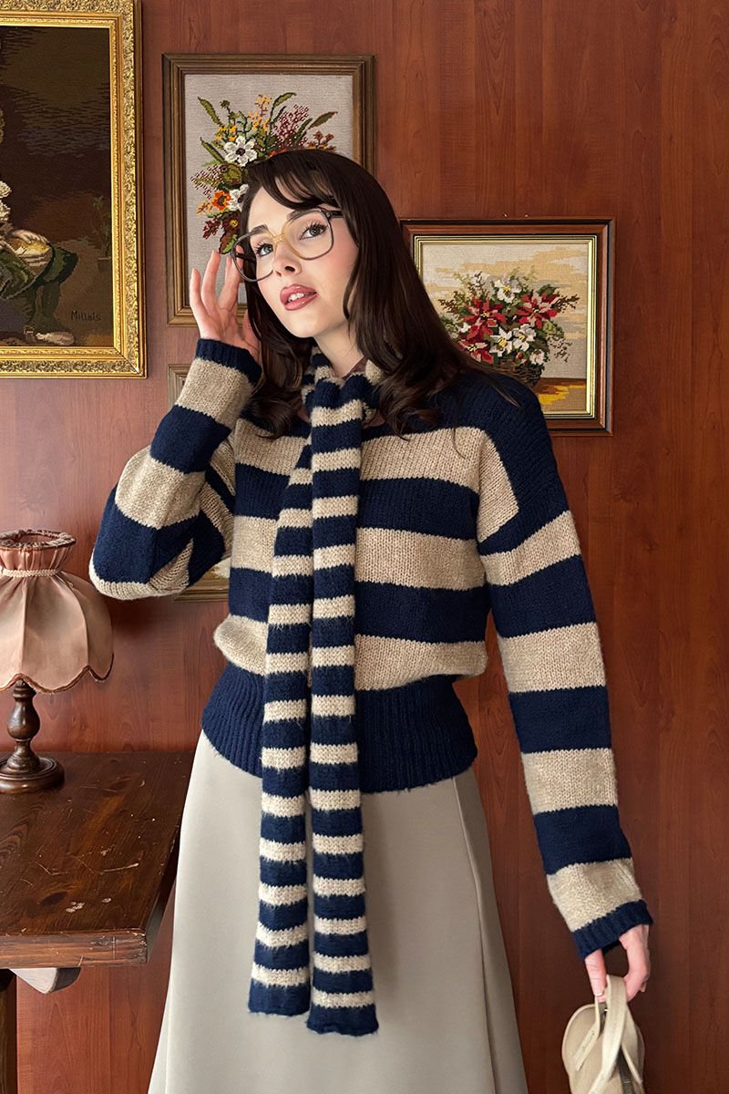 Lacivert Krem Çizgili Atkı Detay Kazak