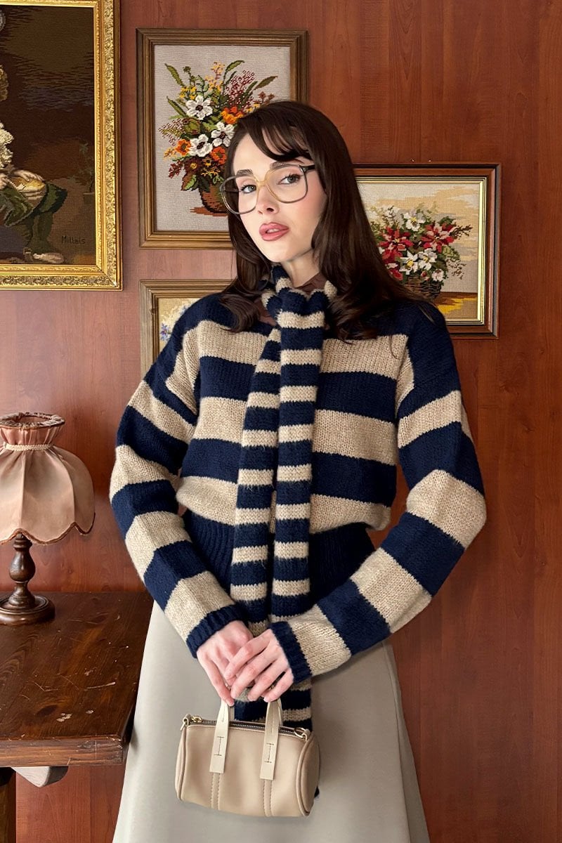 Lacivert Krem Çizgili Atkı Detay Kazak Ceylan Otantik'in seçimi Lacivert Krem Çizgili Atkı Detay Kazak. Vintage ve tesettür kadın giyim şıklığı uygun fiyatlı parçalarla Kazak Koleksiyonu'nda! CEO000002041 Lacivert Krem Çizgili Atkı Detay Kazak