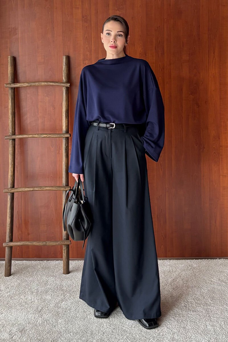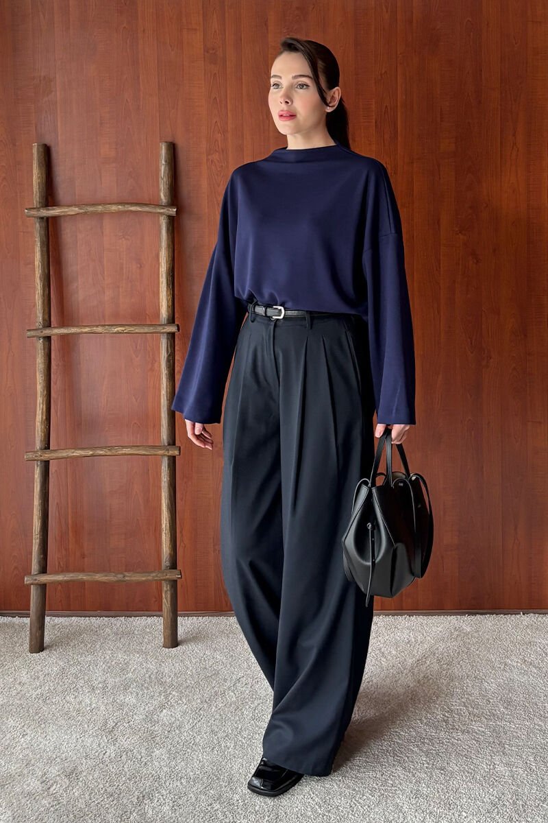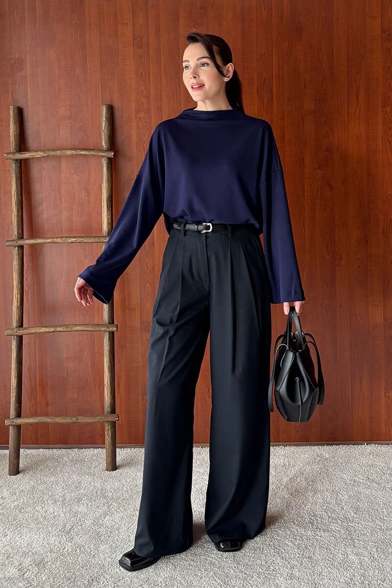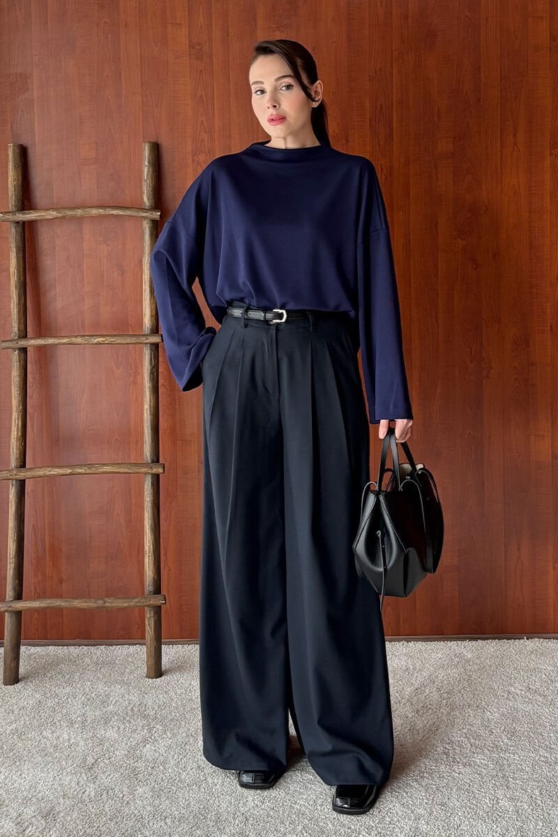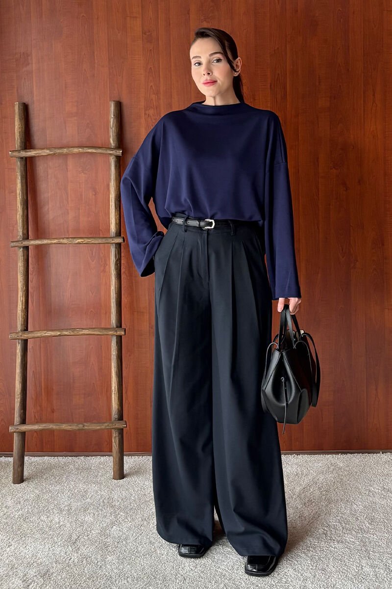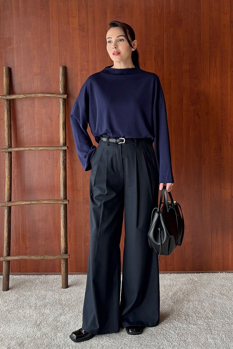 Lacivert Oysho Dik Yaka Bluz & Siyah Pile Detay Palazzo Pantolon
