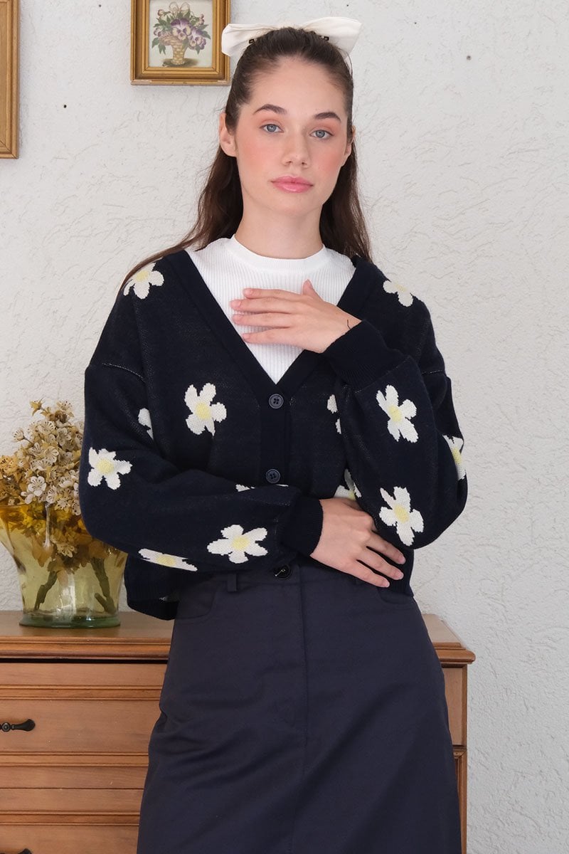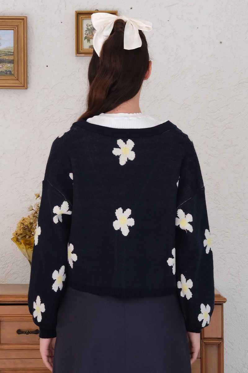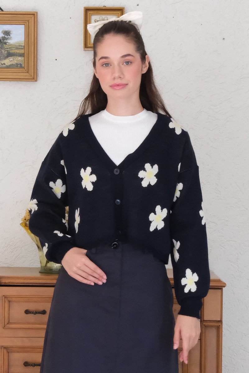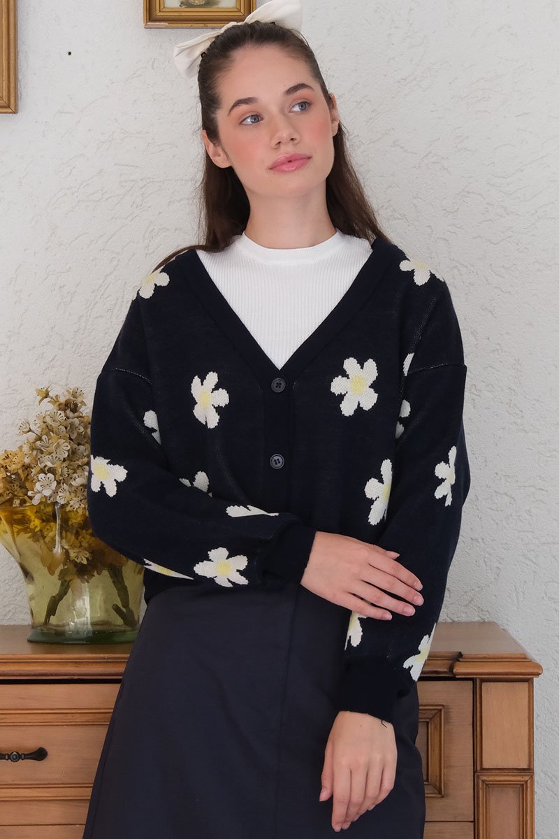 Lacivert Papatya Desen Triko Crop Hırka
