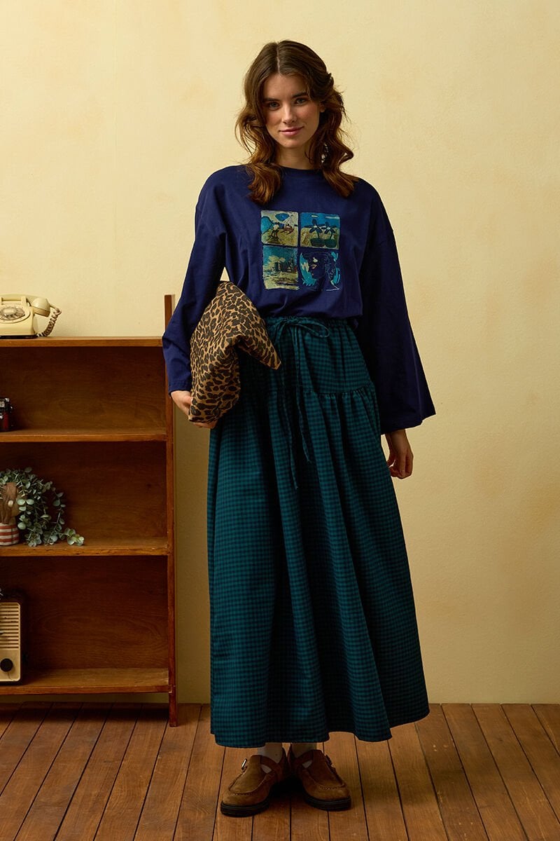 Lacivert Summer Baskılı Basic Body & Zümrüt Pötikare Fırfır Detay Poliviskon Etek Takım