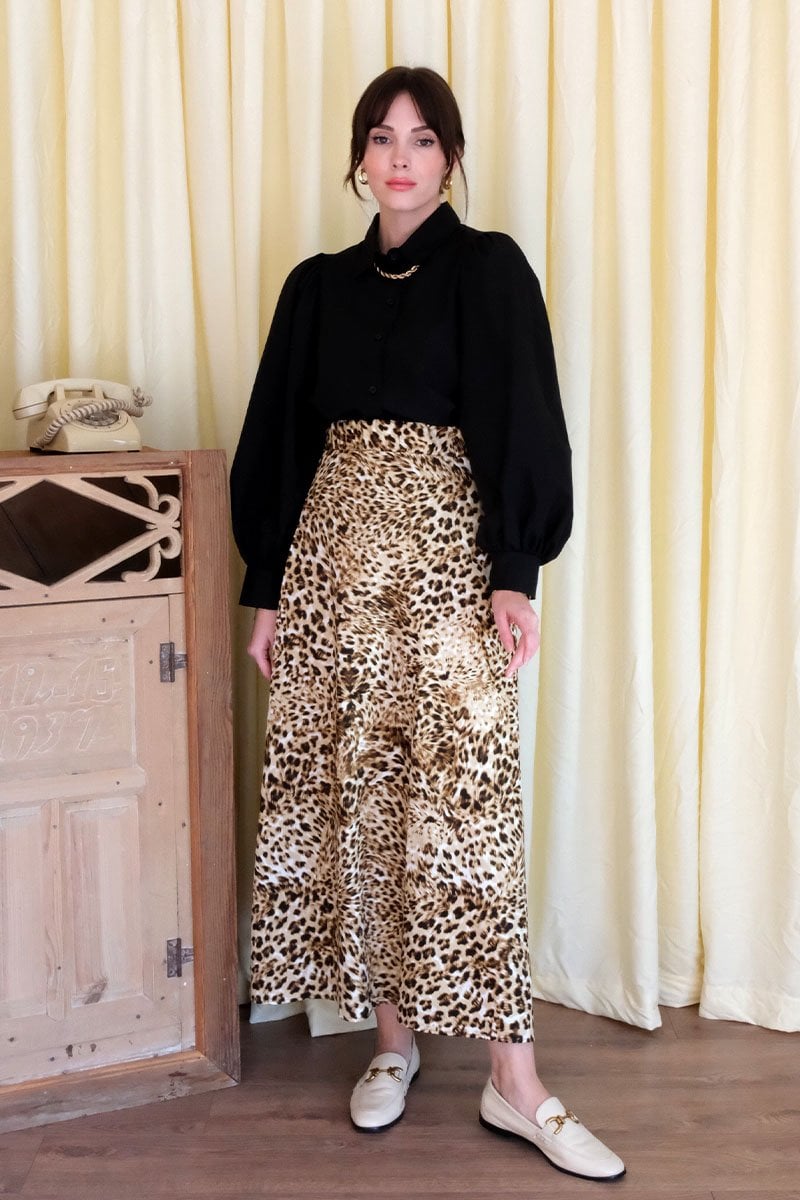 Leopar Desen Pamuk Saten Kloş Etek