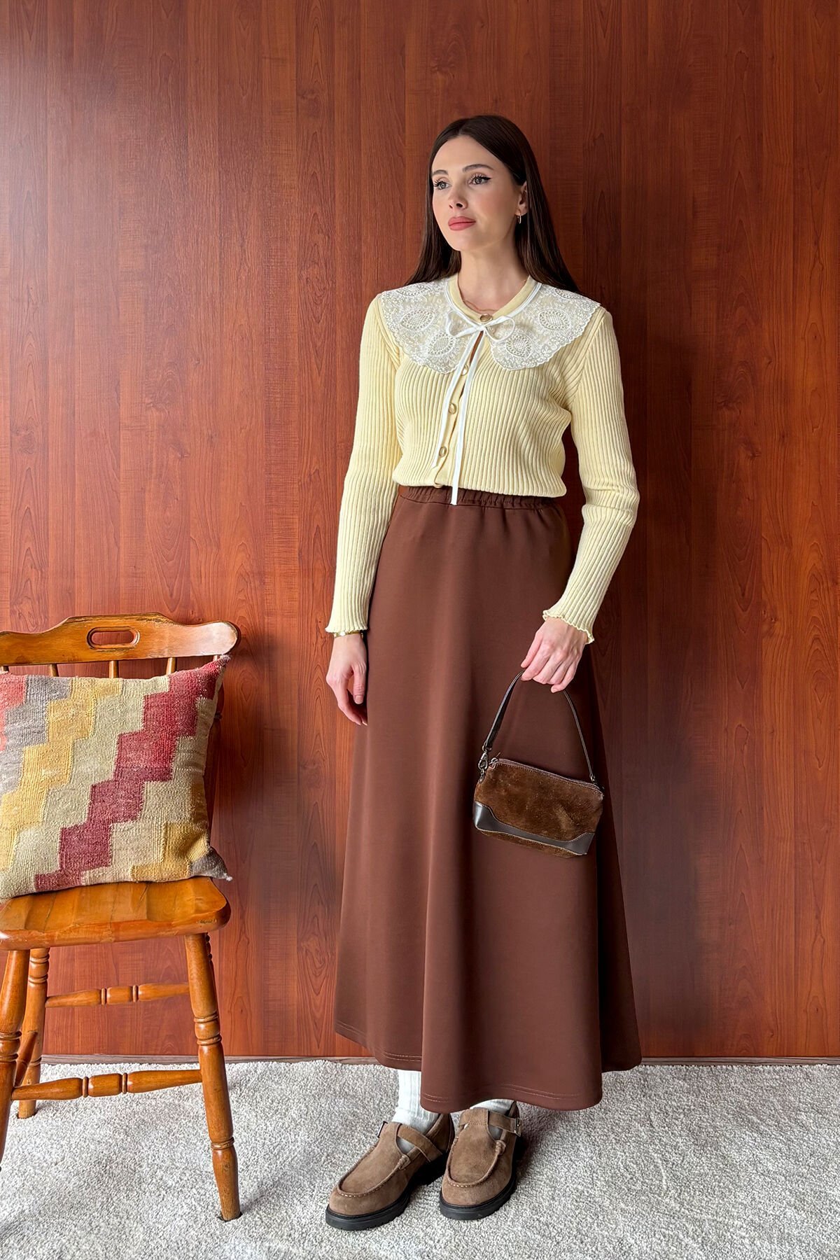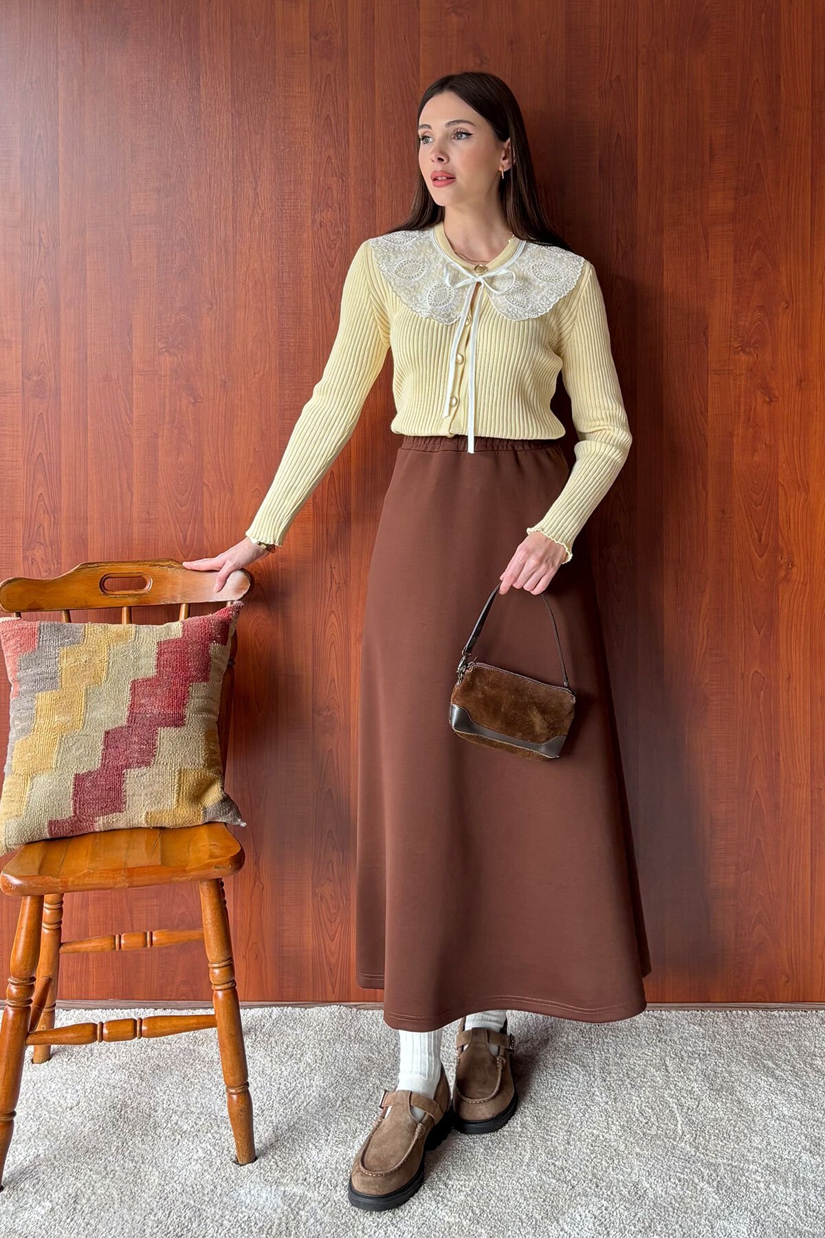 Limon Sarısı Beyaz Yakalı Triko Hırka & Acı Kahve Scuba Etek Takım