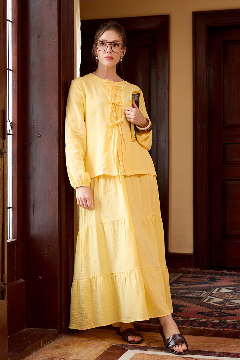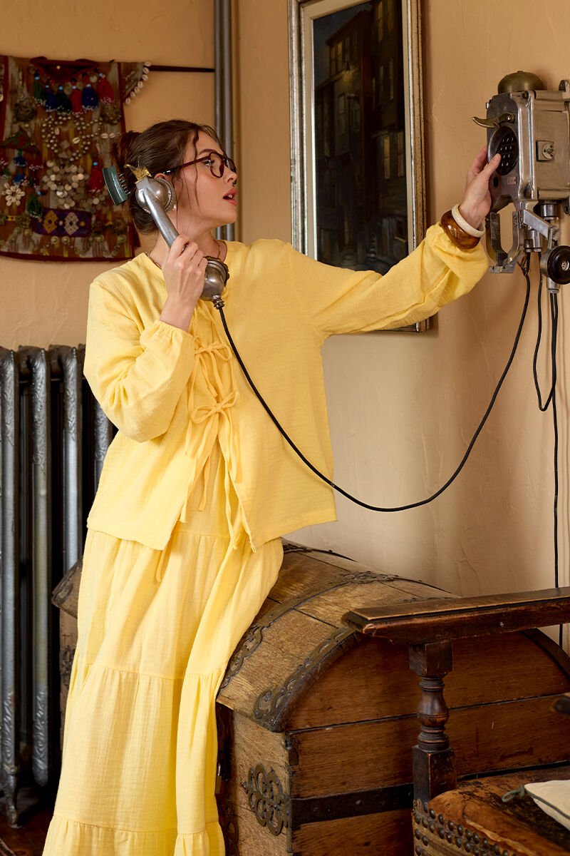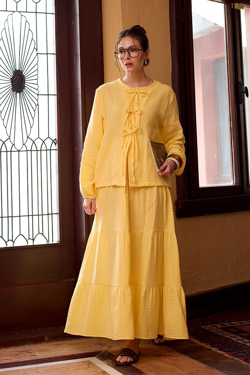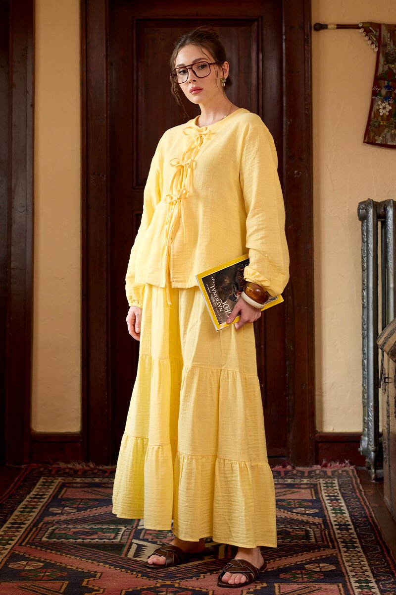 Limon Sarısı Müslin 3 Fiyonklu Bluz