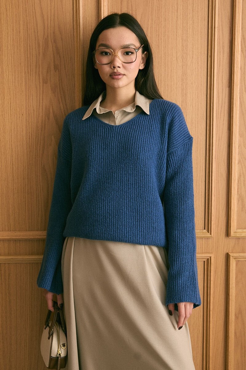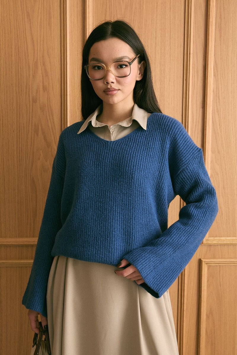 Mavi V Yaka Triko Kazak