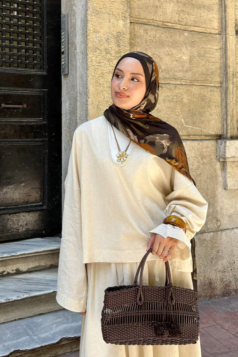 Bu organik keten V yaka bluz, sizi rahat ve şık hissettirecek.