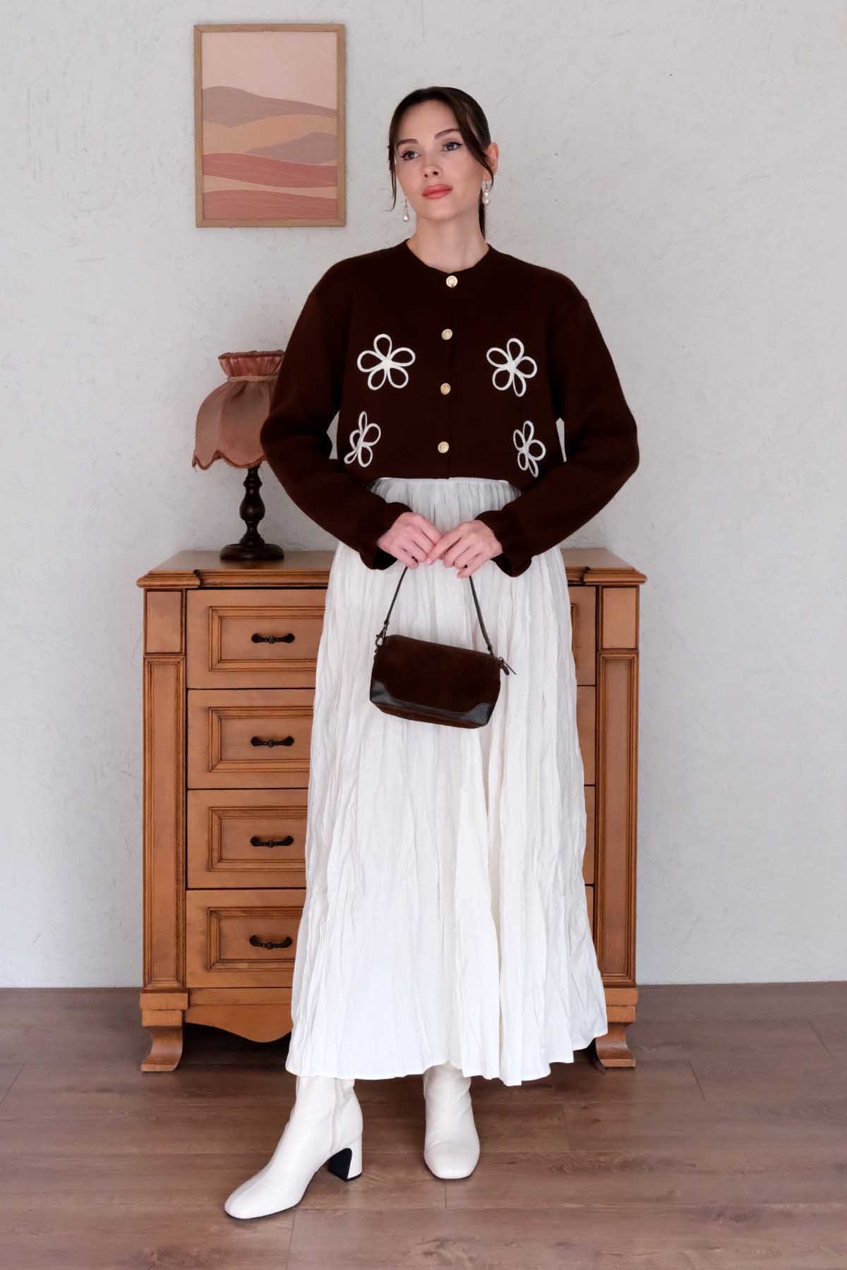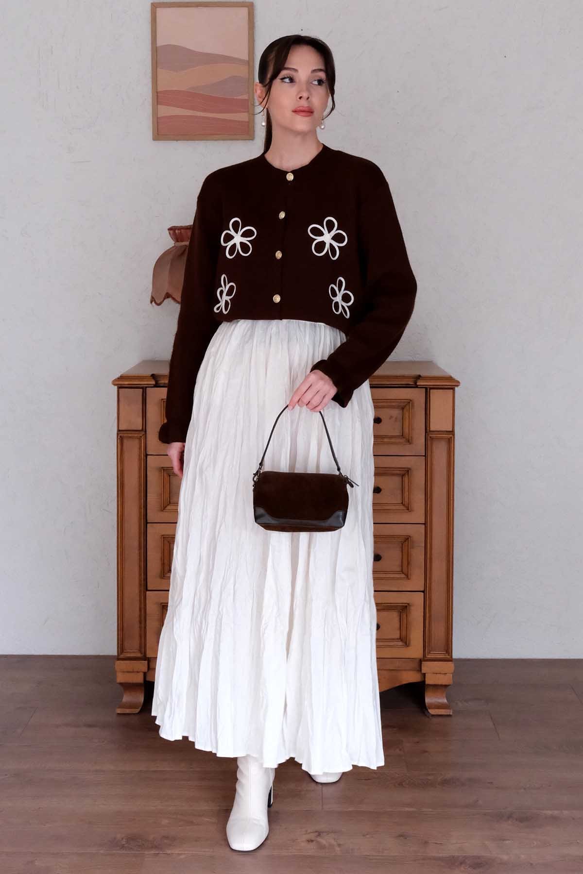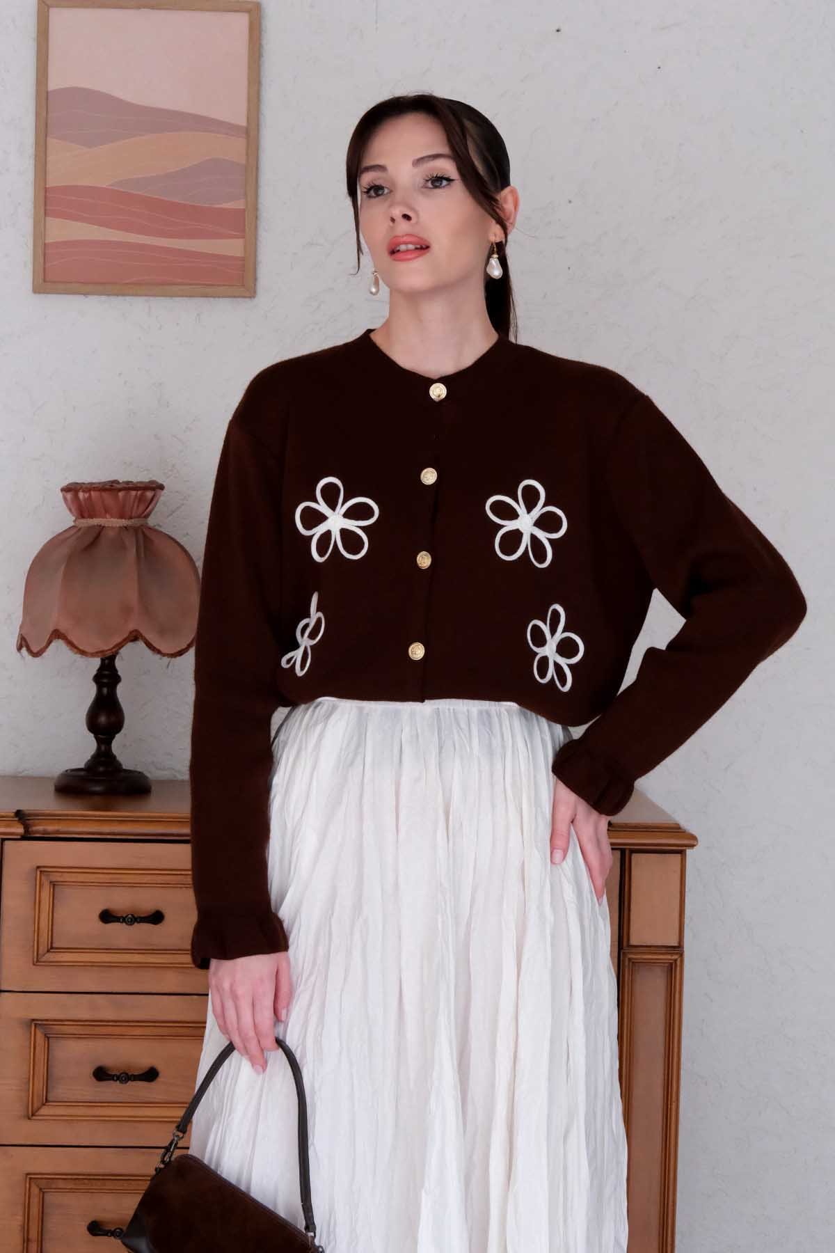 Papatya İşlemeli Acı Kahve Hırka