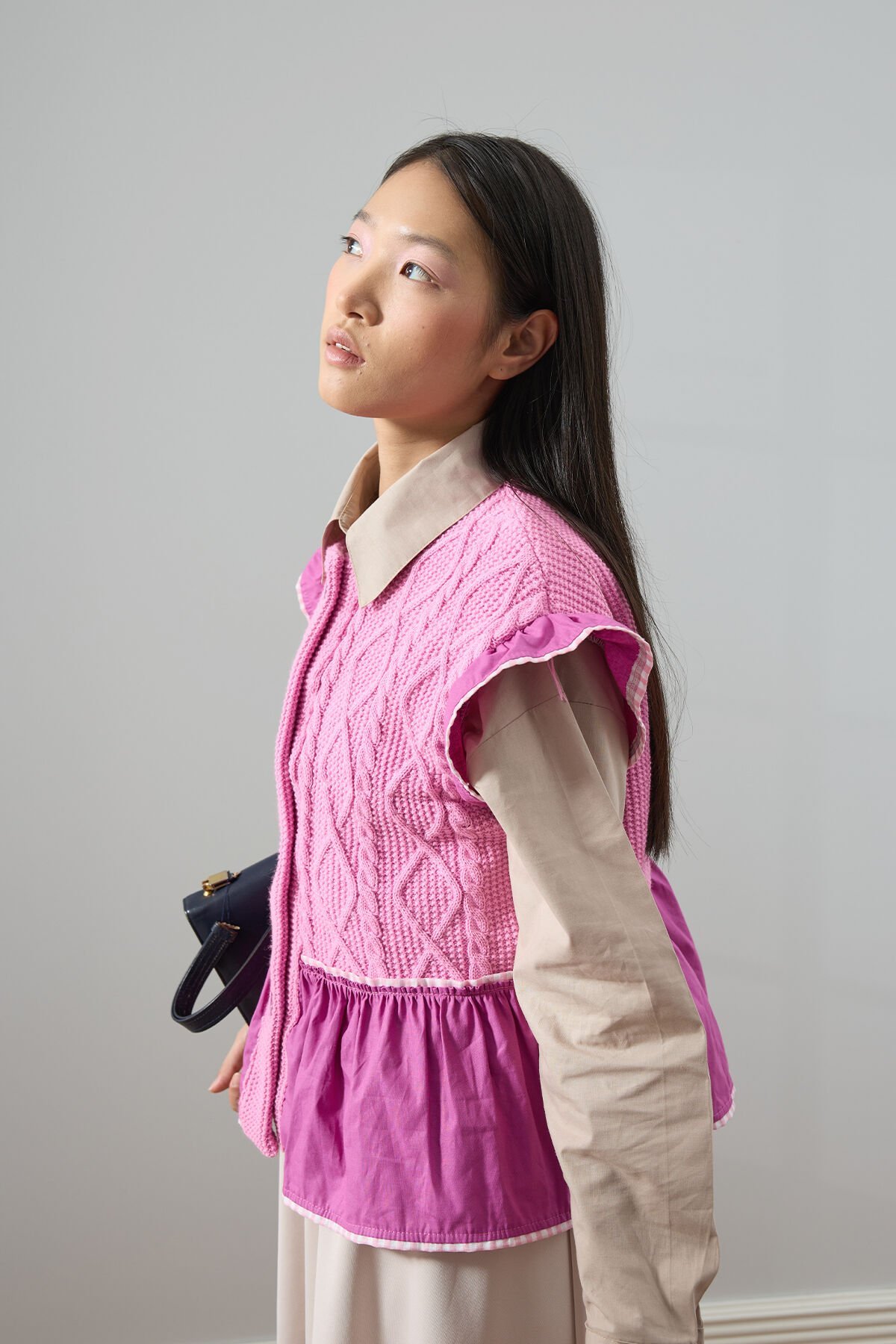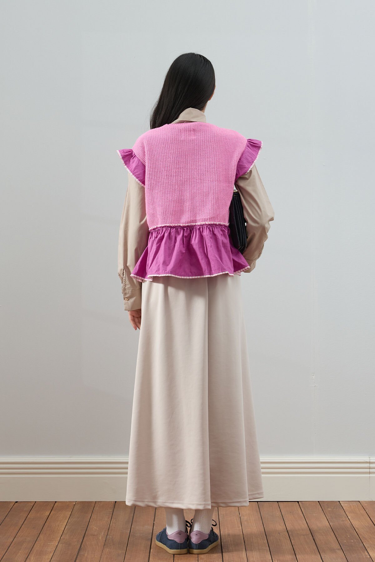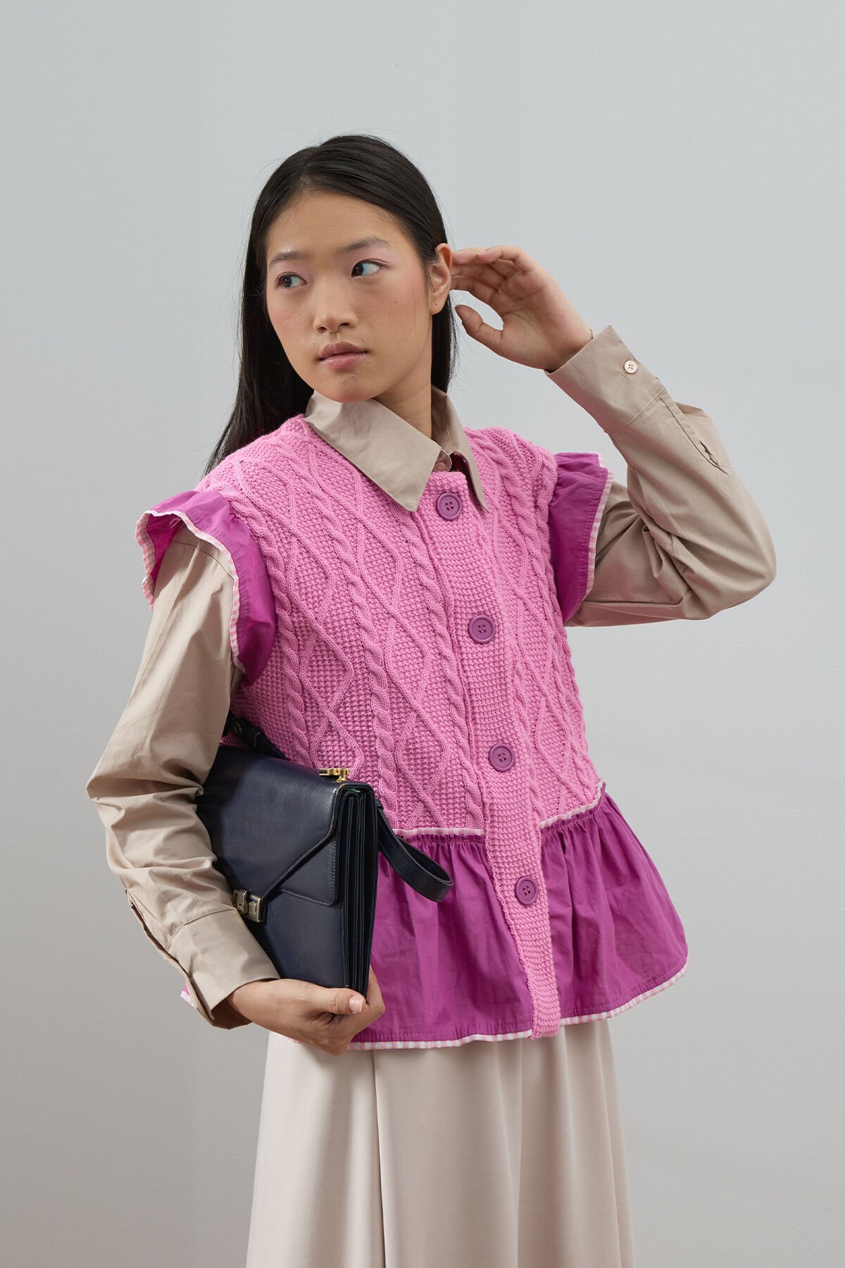 Bu fırfırlı triko yelek, hem şık hem de rahat bir görünüm sunar.