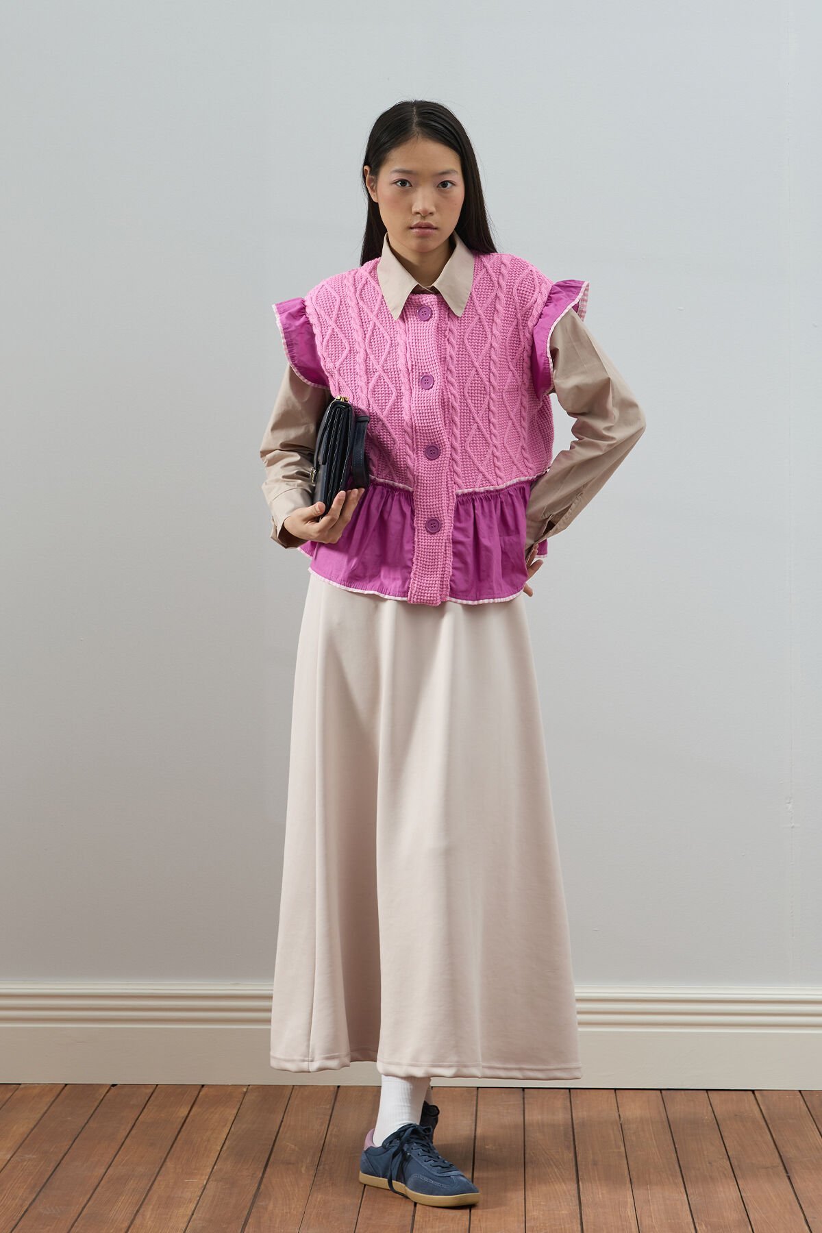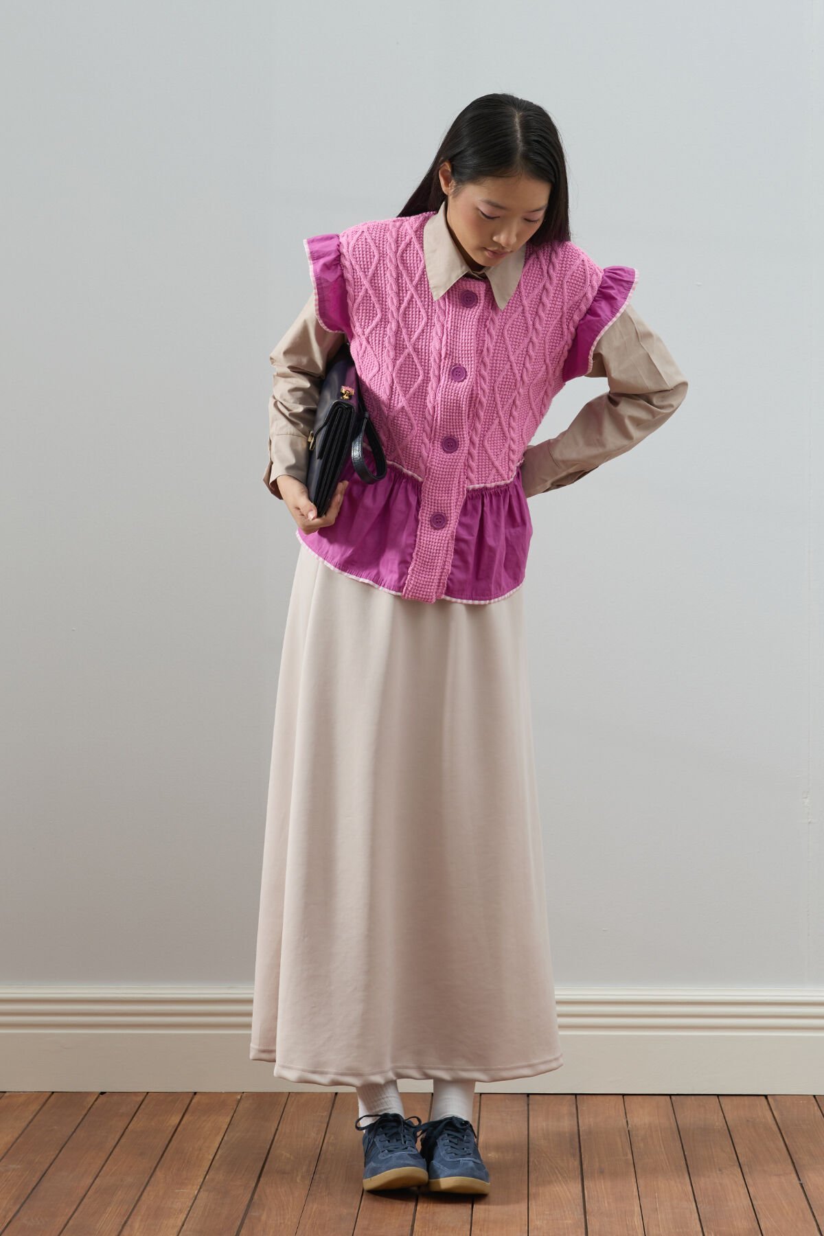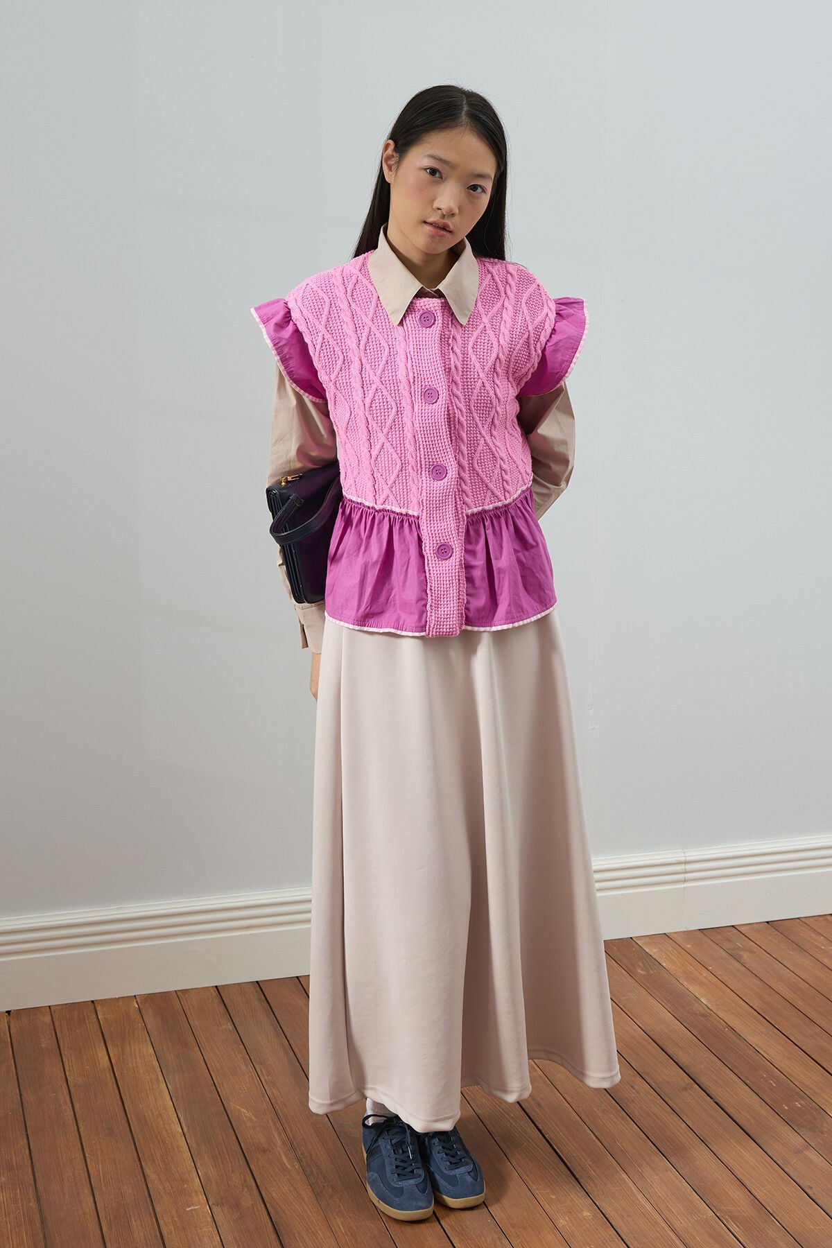 Bu fırfırlı triko yelek, hem şık hem de rahat bir görünüm sunar.